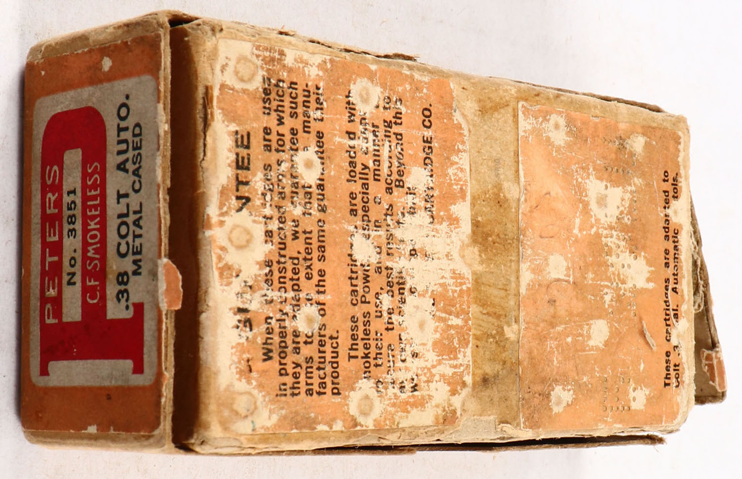 Peters, C.F. Cartridges, .38 Colt Automatic, Metal Cased, Full, 2pc. Buff box with white red & orange wraparound label, lid has 2 seam splits on left end of lid, good to very good color, minor age soiling, some staining & shelf wear, some edge & corner wear, label is intact, ammo is excellent. Grade: Good ++ - Value: 20 to 60