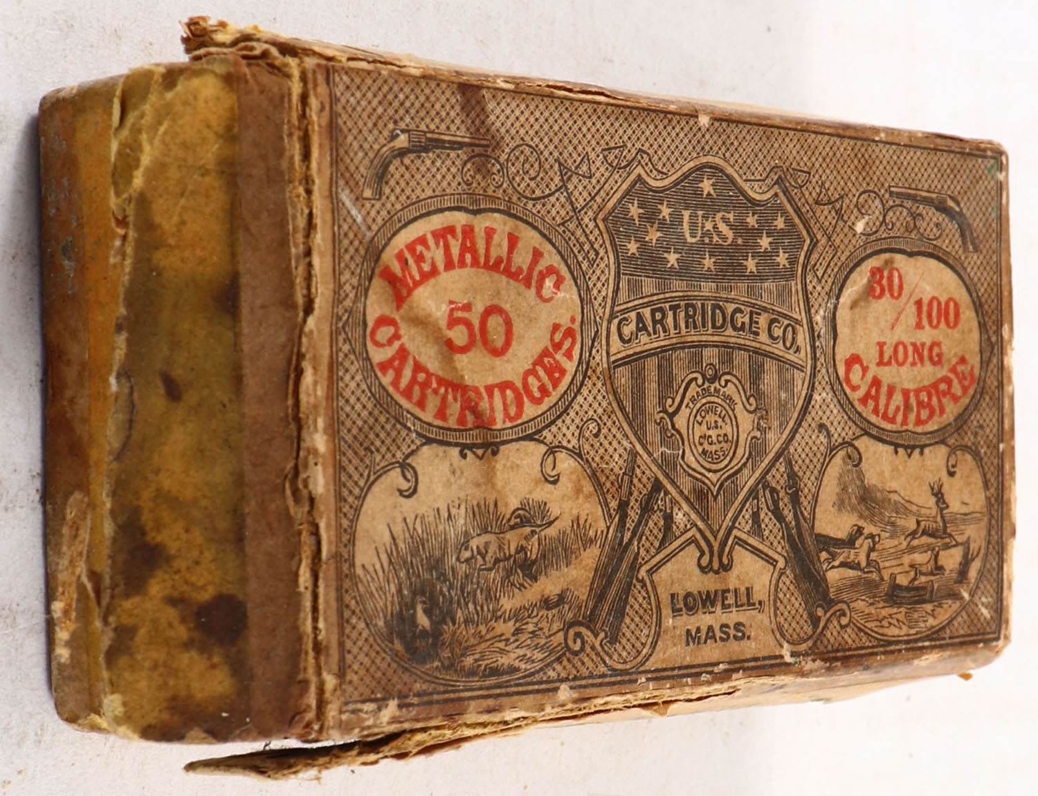 U.S., Metallic Cartridges, .30 Long Rim Fire, Partial 37rds. 2pc. Buff box with gray top & orange side sealing labels, vertical seam splits to all corners of lid, partial seam split to top front edge, fair to good color, age soiling, edge & corner wear, labels are intact, ammo is good to very good. Grade: Good - Value: 16 to 60