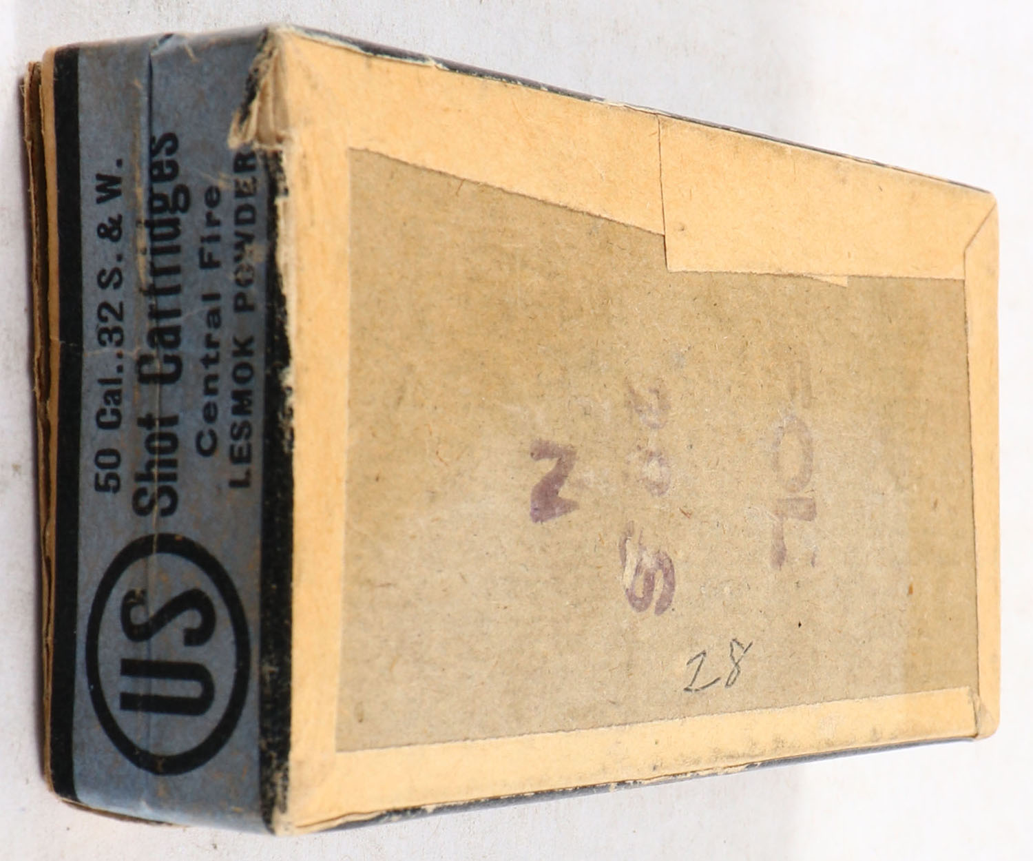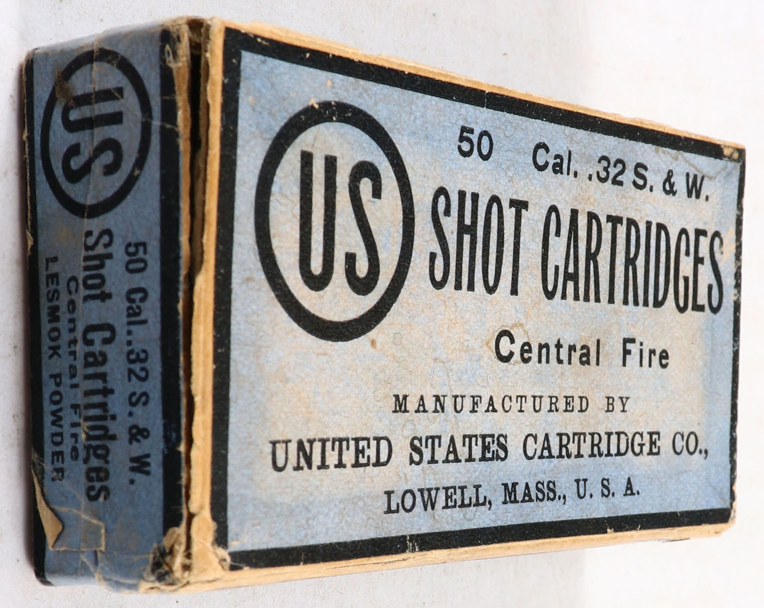 U.S., Central Fire Shot Cartridges, .32 Smith & Wesson Shot, Partial 28rds. 2pc. Buff box with blue top & side sealing labels, box has 3 seam splits on top, excellent color, some color fading, some edge & corner wear, side sealing labels are sealed, labels are intact, ammo is excellent. Grade: Very Good - Value: 20 to 60