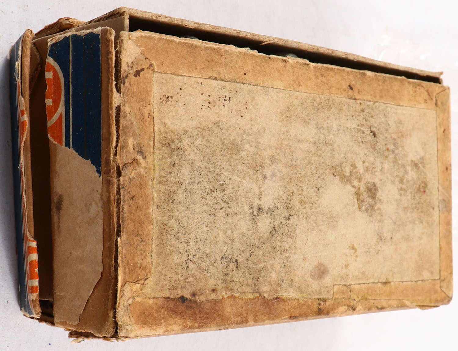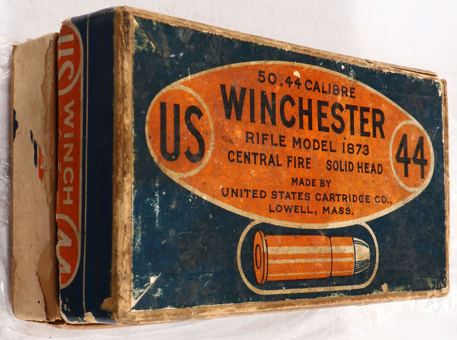 U.S., .44 Winchester, Solid Head, Partial 31rds., 2pc. Buff box with blue & orange labels, box is falling apart, multiple seam splits, back side of bottom is torn off, edge & corner wear, good to very good color, some age soiling, ammo is very good. Grade: Poor - Value: 10 to 50