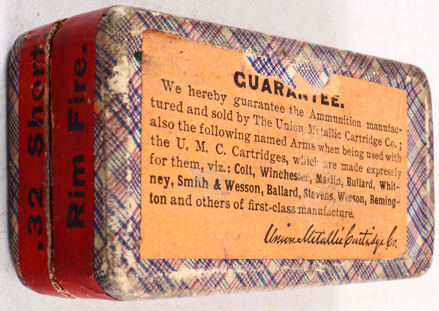 UMC, Rim-Fire Cartridges, .32 Short Rim Fire, Swaged Bullets, Full, 2pc. Purple fabric box, box is solid with excellent color, very minor age soiling, very minor edge & corner wear, labels are intact, ammo is very good. Grade: Excellent - Value: 40 to 120