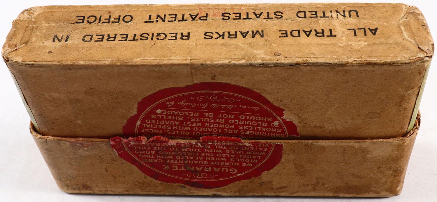 UMC, Central Fire Cartridges, .25-36 Marlin, 117 Soft Point Bullet, Partial 4rds., 2pc. Buff box with buff label, box is solid with excellent color, minor age soiling & corner wear, edges are mostly crisp, label is intact, ammo is excellent. Grade: Very Good + - Value: 8 to 40