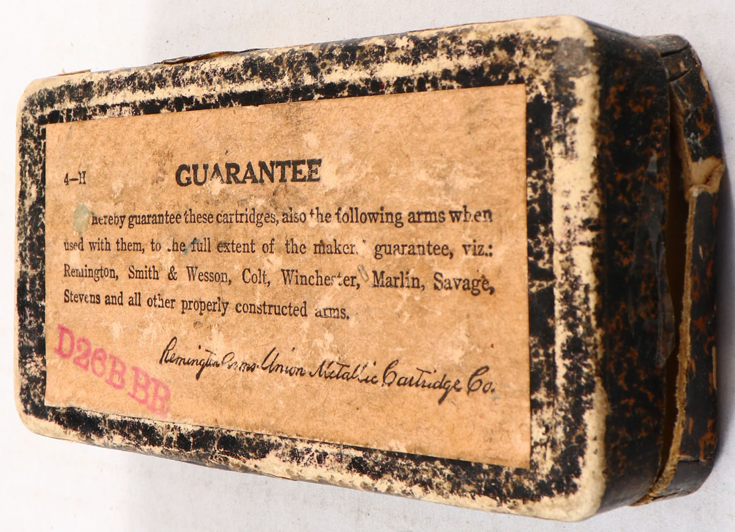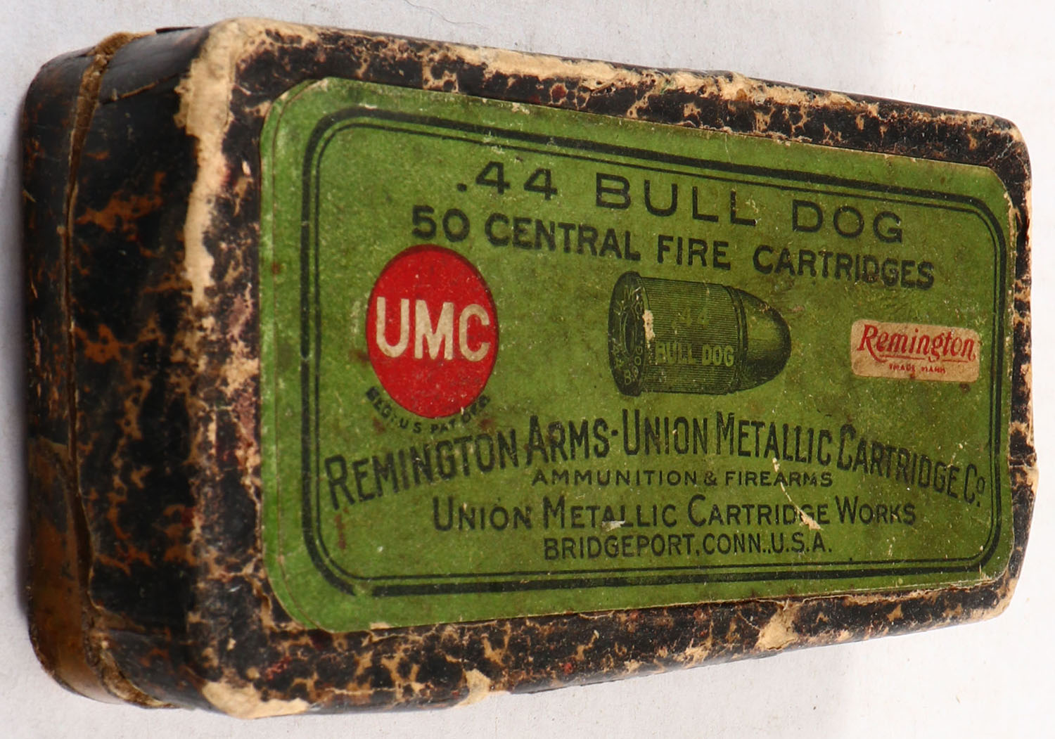 REM-UMC, Central Fire Cartridges, .44 Bull Dog, Partial 1rd. 2pc. Black mottled box, box is solid with very good color, minor age soiling, shelf wear, some edge & corner wear, side sealing label is gone, top label is intact, ammo is fair. Grade: Good ++ - Value: 20 to 100