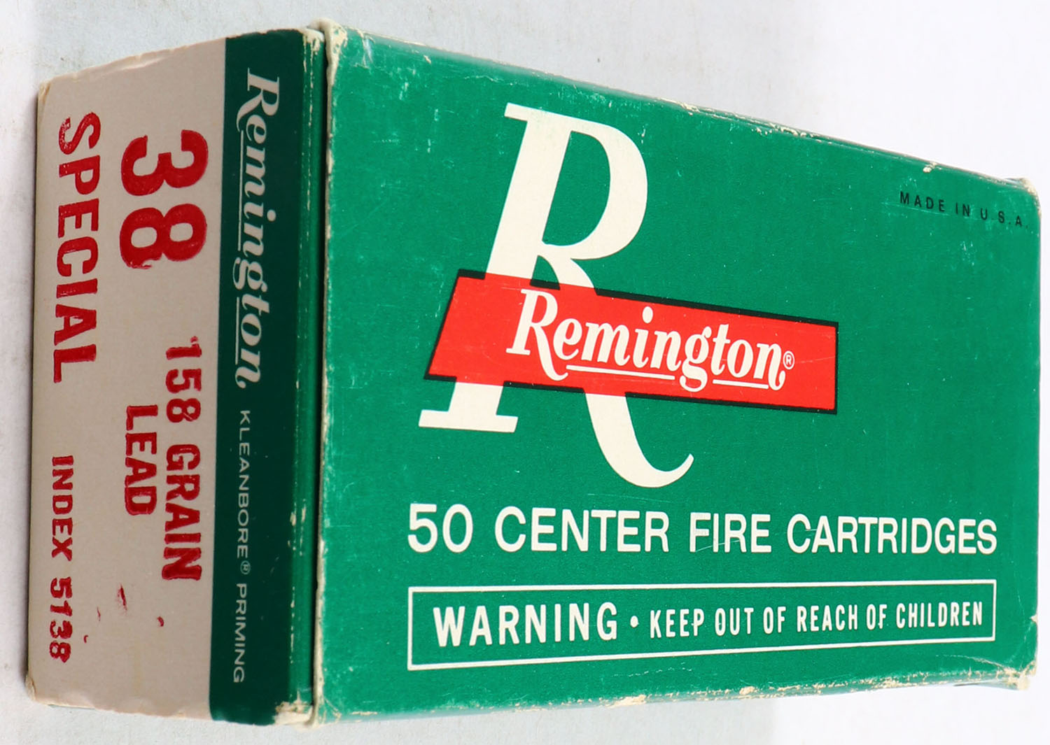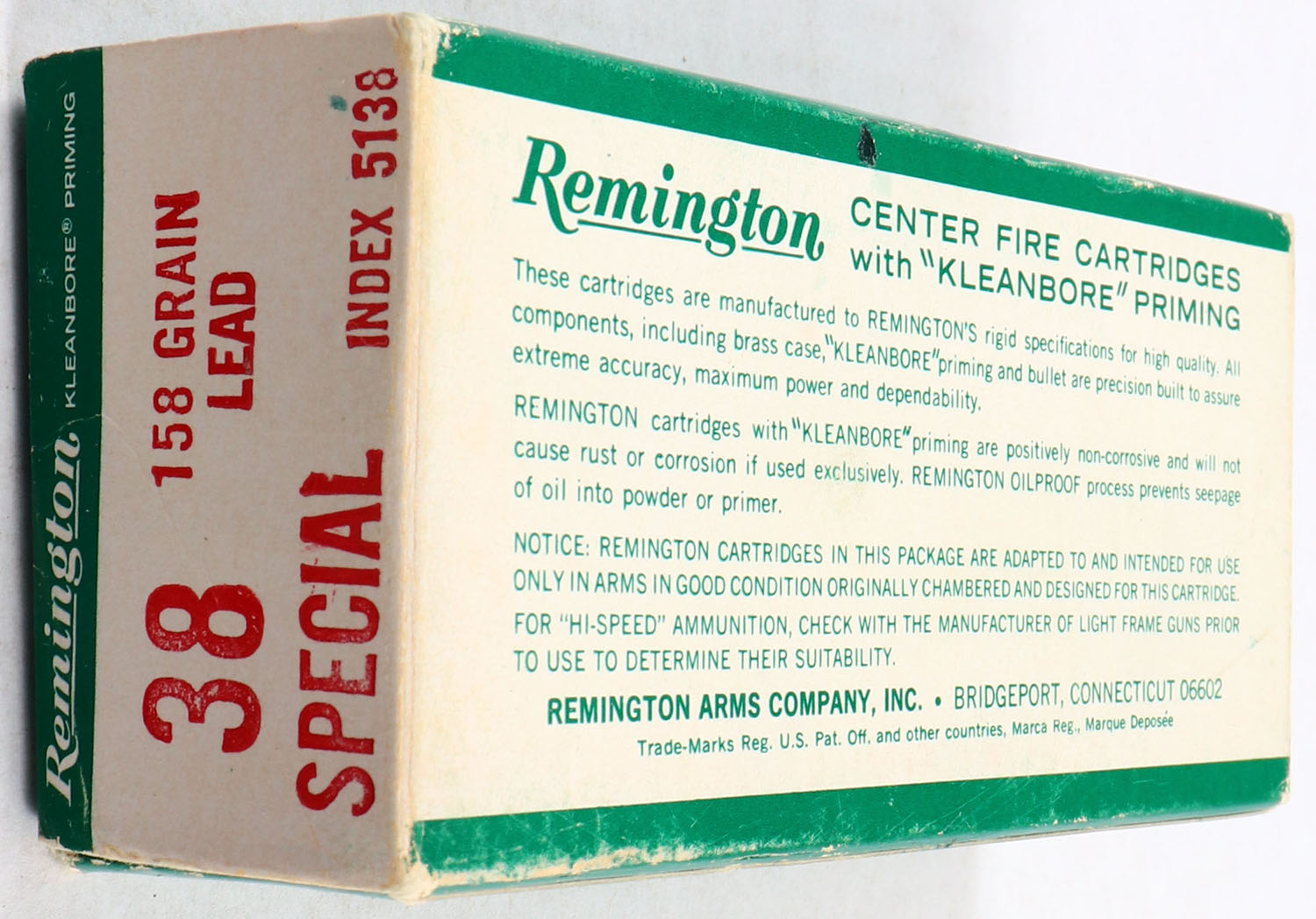Remington, .38 Special, Kleanbore, 158 Gr. Lead Bullet, 1pc, Full, green/white box with red/white print, box is solid with good color, has some edge & corner wear, ammo is excellent. Grade: Very Good ++ - Value: 30 to 60