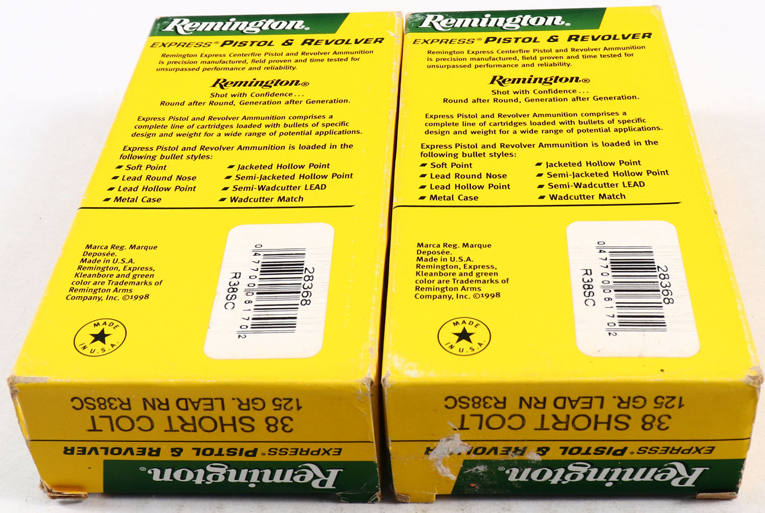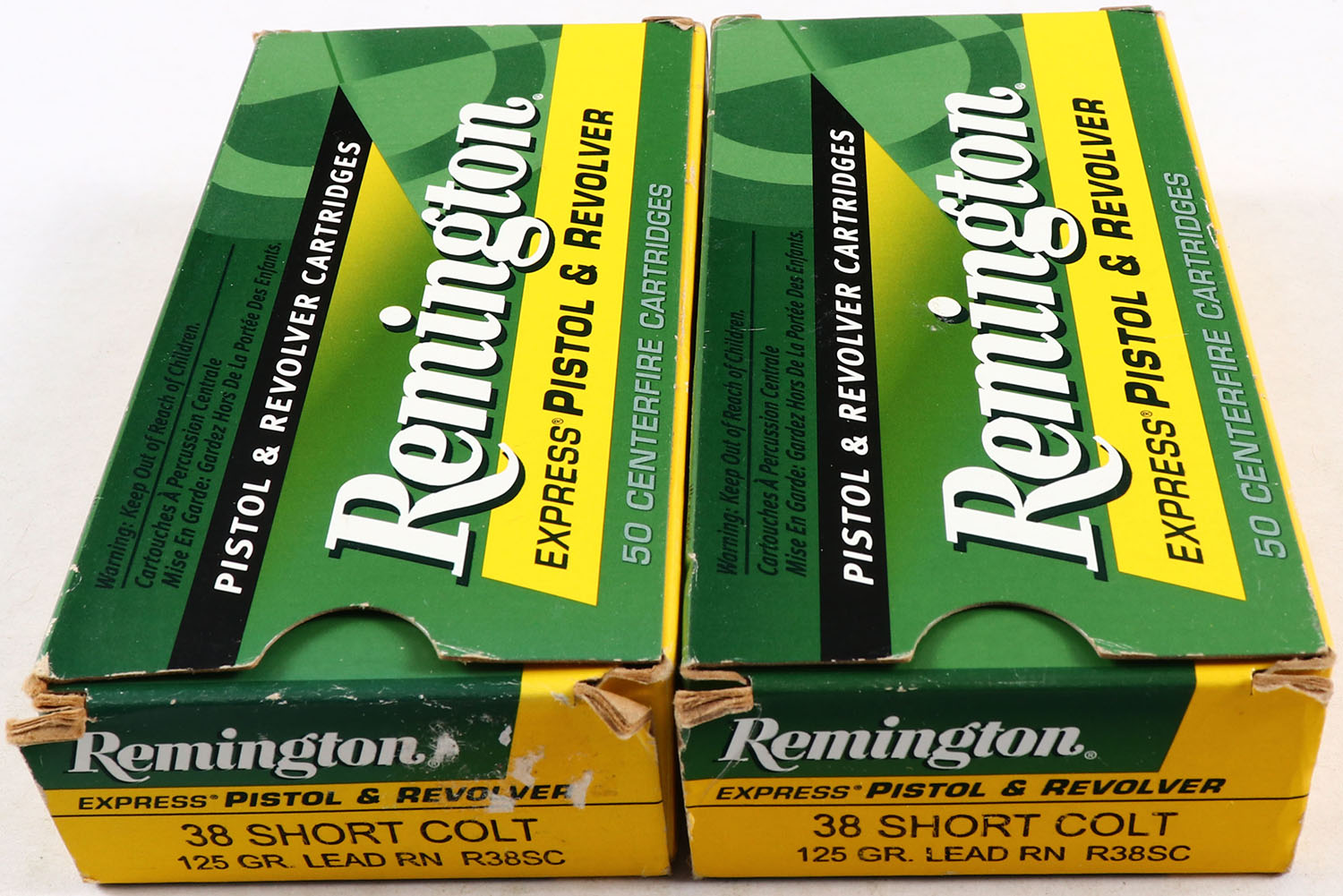 Remington, Lot of 2, Express, 38 Short Colt, 125 Grain Lead Round Nose, Full, 1pc. Yellow, green, white & black box, box is solid with very good color, end flaps are solid, ammo is excellent. Grade: Excellent - Value: 20 to 60
