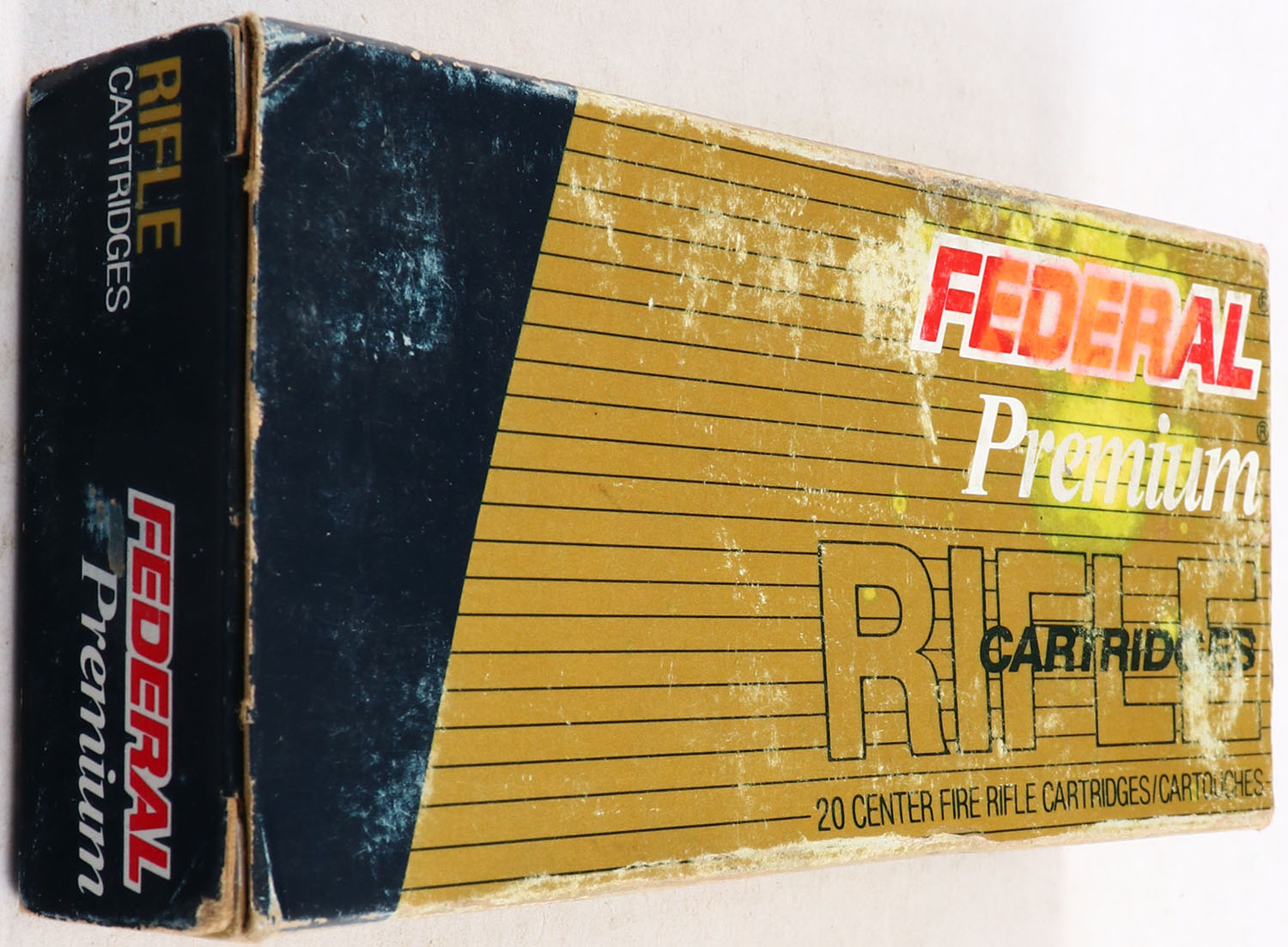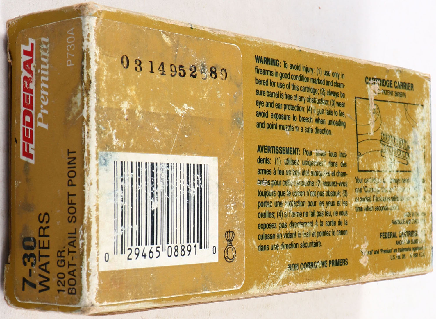 Federal, Premium, 7-30 Waters, 120 Grain Boat-Tail Soft Point, Full, 1pc., multi-colored box, box is solid with soiling, box has shelf wear, end flaps are solid, ammo is excellent. Grade: Very Good++ - Value: 20 to 80