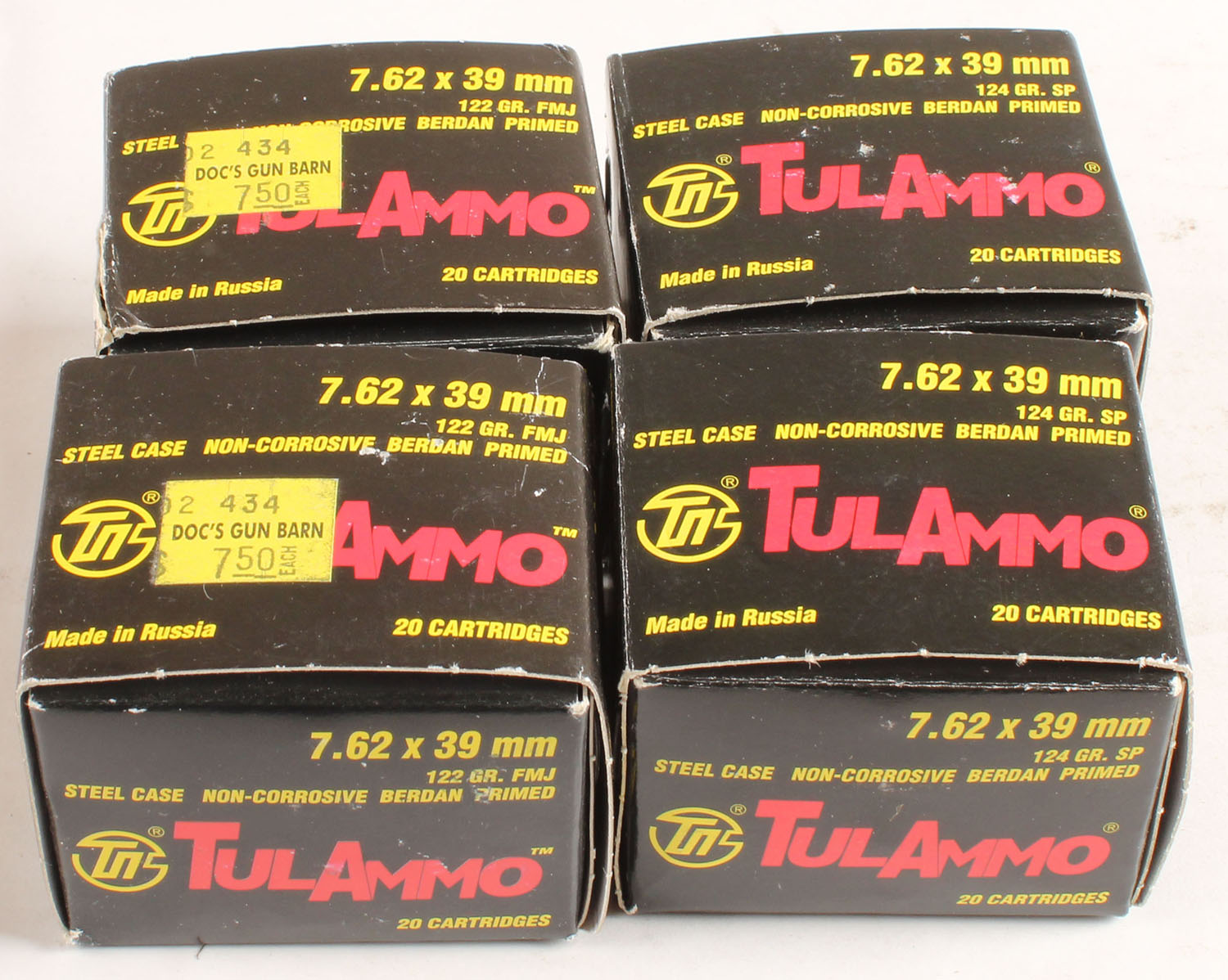 Tul-Ammo, Lot of (4), 7.62x39 mm, 124 Grain SP, Steel Case, Full, boxes are excellent, ammo is minty. Grade: Excellent ++ - Value: 20 to 50