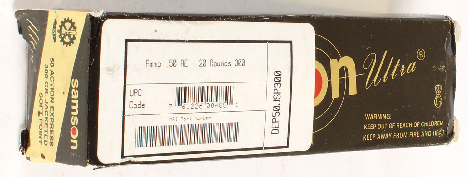 Samson, Ultra, .50 AE, 300 Grain Jacketed Soft Point, Full, 1pc. Black & gold box, box is solid with minty color, very minor corner wear, edges are crisp, end flaps are solid, ammo is excellent. Grade: Excellent ++ - Value: 20 to 60