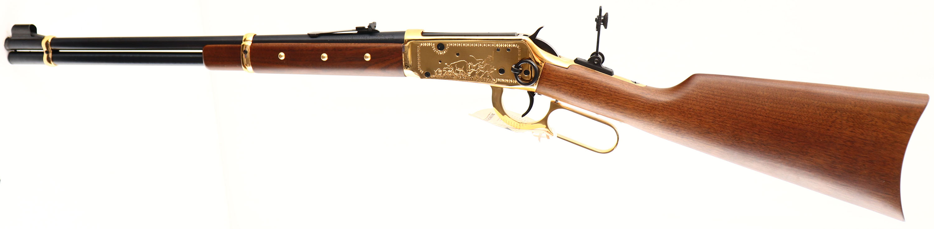 BOXED Winchester, Model 94 Cheyenne Carbine, 44-40 WIN Cal., MFG. 1977, SN: CH01264, Lever Action, 20'' barrel. In 1977 Winchester produced 11,220 of these Commemorative Cheyenne Carbines. The gold washed receiver is engraved on both sides with vignettes that celebrate the ''Great Plains Cheyenne's''. The handsome straight grip walnut stocks carry gold washed tacks in the forend & a gold tone Cheyenne medallion inlayed into the right side of the stock. The stock & the factory finish are basically mint. The gold tone receiver, lever & barrel bands are excellent. The original metal blue is 99.9%. Bore is mint. The rifle is fitted with a sliding aperture adjusting tang sight, while the barrel carries the original adjustable rear & hooded blade front sights. The stock carries a blued crescent metal buttplate. Comes in the original numbers matching styro box, with sleeve, wax paper, hanging tag & paper work. Sleeve is excellent. Another excellent Winchester collectible. FFL or C&R Req. - Value: 1000 to 2000