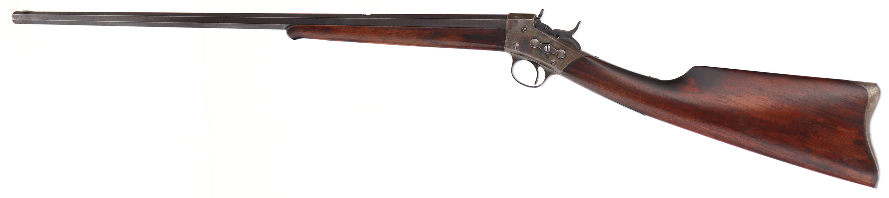 Remington, Model 2, .32 SHORT or LONG R.F., MFG 1873-1909, SN: 33779, Rolling block single shot rifle. 26 1/8'' Octagon barrel. The original straight grip, perch belly wood stocks are very good & solid, showing several small marks & contusions to what appears to bean added layer of finish over the original finish. The schnabel forend has a small chip at the ebony insert. The barrel has toned to an even brown patina, while the case-hardened receiver has faint outlines & remains of case-colors, with the majority faded gun metal gray & a thin brown patina developing. Bore is very good. Barrel an open rear dovetail & a blank filled front dovetail, no sights. The stock carries the original smooth metal buttplate. FFL or C&R Req. - Value: 300 to 600