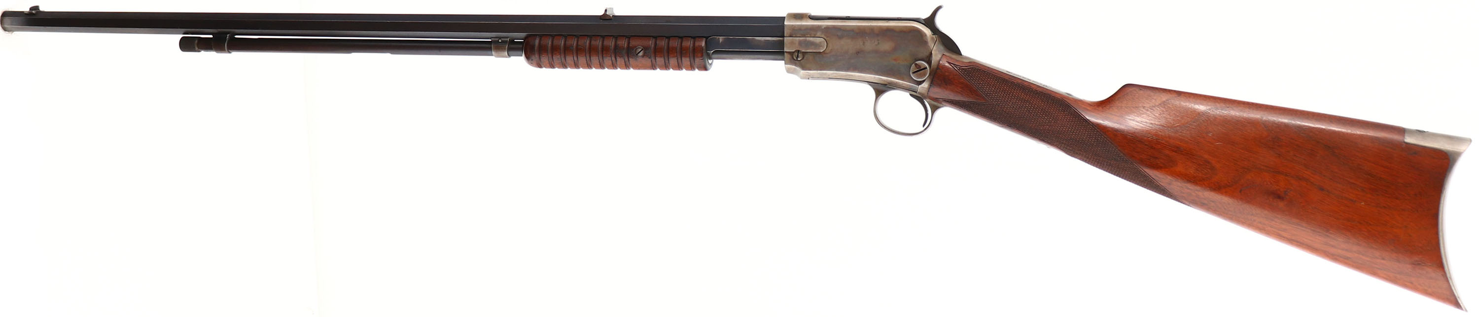 RARE DELUXE Winchester, Model 1890, 2nd variation, .22 WRF, Cal., MFG. 1896 (Antique), SN: 42241, Pump Action Rifle, 24 1/4'' Octagon barrel. The deluxe, hand checkered & straight grip wood stocks are excellent, with excellent finish & a few tiny handling marks & light scratches. The metal blue finish has 95% coverage on the barrel, 85% mag, thinning & toning. The case-hardened receiver displays fantastic case-colors, which includes the elongated ghost outline on the left side. The left side of the upper left tang is stamped with the caliber marking ''WRF'' inside the wood. The rifle is fitted with fixed rear & small blade front sights. Excellent bore. Case-hardened crescent metal buttplate. Smooth tight action. This is a very rare & collectible case-hardened 1890 antique rifle. Antique, No FFL Req. - Value: 4500 to 6500