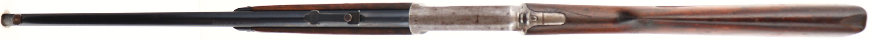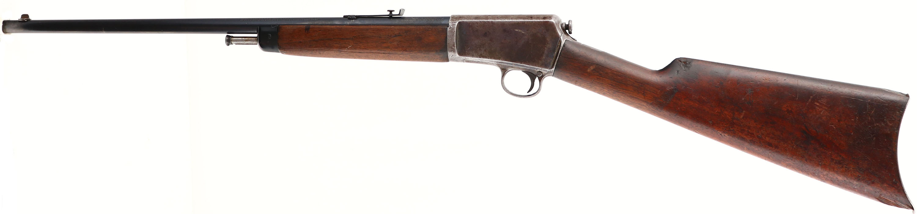 Winchester Model 1903, CAL: .22 WIN Automatic, MFG:1906, SN: 29108, Semi-Auto Rifle, 20'' Tapered round barrel. The original straight grip wood stocks are fair, with several horizontal stress cracks located at the wrist & another 5.5'' tight stress crack on the left side of the forend. The toe & upper comb of stock by the buttplate have wood chips & there is a gouge & crack at the front of the upper comb. The original finish shows lots of wear, thinning & oil staining. The metal blue finish on the barrel rates 90%, while the receiver has worn mostly gun metal gray, with a thin spotty brown patina. Forend cap appears to be reblued. Bore is excellent. The rifle is fitted with updated rear & front sights. Crescent metal buttplate. FFL or C&R Req. - Value: 150 to 300