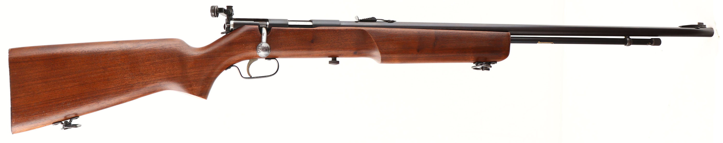 Mossberg, Model: 46A, Cal: .22 S.L.LR, MFG: 1938-39, S/N: None, Bolt action rifle, 26'' barrel. The cheeked & flat pistol grip, walnut stock is excellent, with only a couple minor contusions or marks to the original finish. The original metal blue finish has almost full coverage (90%), but the barrel is starting to tone plum/gray. The bore is excellent. The receiver is fitted with a fully adjustable Mossberg marked peep sight, while the barrel holds a U-notch leaf rear & a wide blade front sights. The stock carries a grooved, blued steel buttplate. Sling loops. Excellent overall. FFL or C&R Req. - Value: 300 to 600