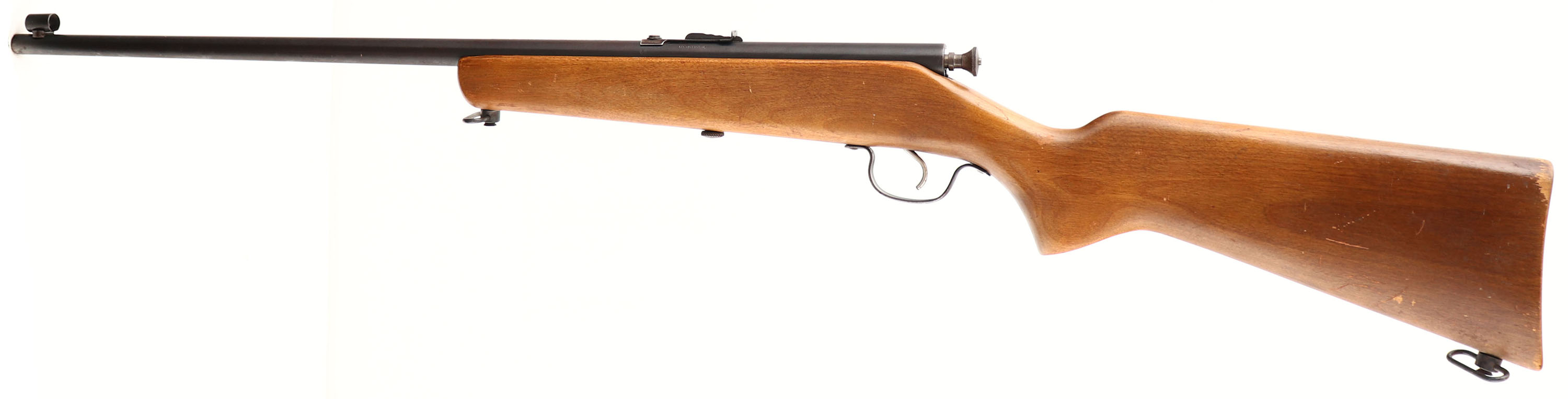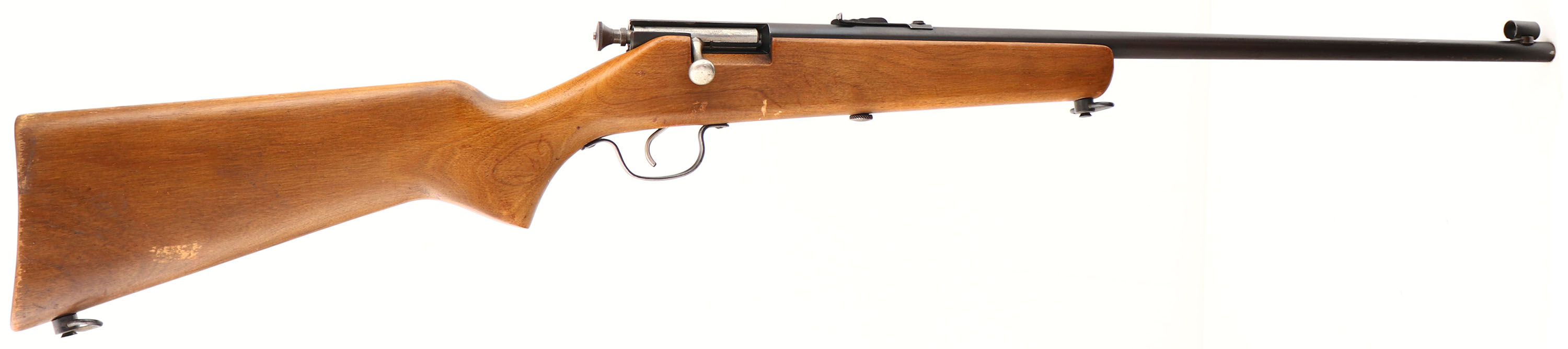 Springfield Stevens Arms Co., Model 15, CAL: .22 S. L. & LR., MFG: 1937-47, SN: NONE, Bolt rifle, 22'' Round barrel. The original flat grip stock is excellent, with minor scrapes & scratches to the original finish. The original metal blue finish rates 80% toning to a brown patina as it thins. Bore is excellent. An adjustable rear & hooded front sights. Fabricated without a buttplate. Nickeled trigger. Sling loops. FFL or C&R Req. - Value: 50 to 150
