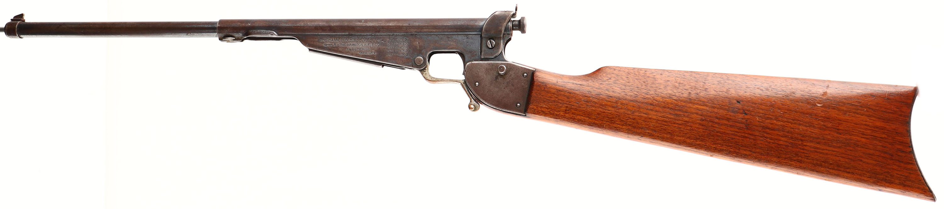 The Hamilton Rifle Co. Model 15, 22 SHORT, MFG: 1902-10 SN: NONE, Under Lever Single Shot Rifle, 8'' round barrel. 27 1/2'' OAL. The original wood stock is excellent, with small scratches & contusions to the original finish, which has an added layer of protective finish. The original metal blue has worn mostly to a brown patina, with remnants of blue in the more protected areas. The company markings & patents are stamped on left side of receiver. Steel rolled barrel, with original brass liner. The 12 groove bore, with 1 turn in 16'', r.h. twist, is fair & clean, with some roughness amongst the worn remains of rifling. Barrel fitted with blade front sight & the original rear peep sight. The brass lever retains a third of the nickel finish. Original thin metal buttplate. Just under 235,000 produced. A rare & nice example. FFL or C&R Req. - Value: 200 to 400