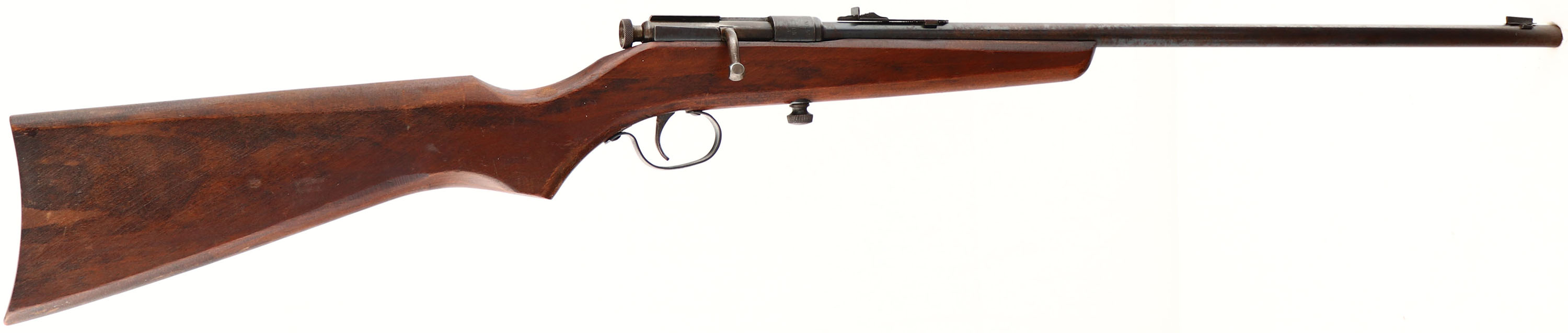 C.J Hamilton & Sons Model 51, 22 CAL S. L. & L.R, MFG: 1935-41, SN: NONE, Bolt Action Rifle, 20'' round tapered barrel. 35 1/2'' overall length. Hamilton's first conventional bolt action type rifle, with a solid steel barrel that screwed into the frame. Also, their first rifle to be marked for the long rifle caliber. The flat board type & flat pistol grip walnut stained birch stock is very good. The stock has small contusions, scrapes & scratches to the original finish. The metal blue finish has worn to mix of remaining blue & gun metal gray, with lots of spotty brown patina & speckles of rust. The 6 groove bore with 1 turn in 20'' is very good. The barrel is fitted with an adjustable rear sight & a small blade front sight. Correctly carries no buttplate. Has an open threaded hole at the rear of the receiver. Likely a quality shooter. FFL or C&R Req. - Value: 120 to 250