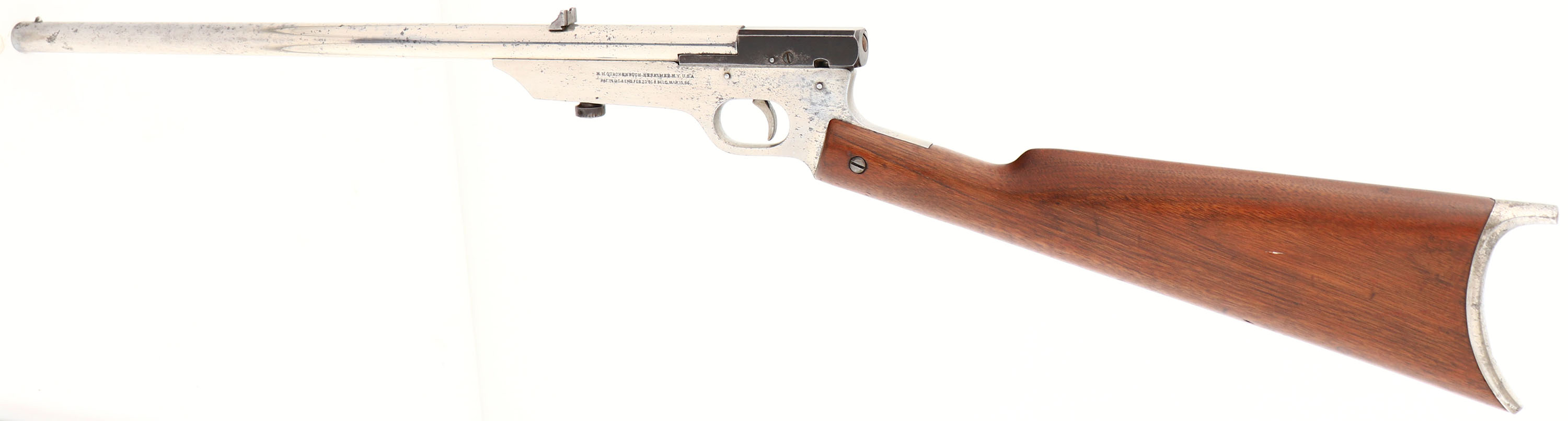 H.M Quackenbush Model ''Safety Cartridge'', .22 Cal., MFG:1896-1908, SN: NONE, Swing Gate Single Shot Rifle, 18'' round barrel. The Safety Cartridge rifle started production in 1896 to 1920, but a wood forearm was added in 1908. This is the earlier version without the forearm. The original straight grip wood stock is good & solid, having been repaired after a wrist break, sanded & refinished. It has three wood dowels used in the repair, of which the ends can be seen in the belly of the stock. The are very few tiny handling marks remaining after refinish & the stock presents very well. The nickel finish was redone after the metal was buffed polished & prepared. It's retained at over 90%, but coverage is over previous rust pitting or blemishes, & the nickel is starting to spot & dull due to corrosion developing under nickel. Stamping on left side of the receiver remain clear. Bore is clean & good, but with scarring amongst thinning rifling. Barrel is fitted with rear fixed sight & a small post blade front sight. Original early swiss style metal buttplate with nickel finish. Broke off cocking handle. Early example. Due to broken bolt handle & possibly other unseen issues, this rifle is being sold ''AS-IS'', with no returns. FFL or C&R Req. - Value: 80 to 150