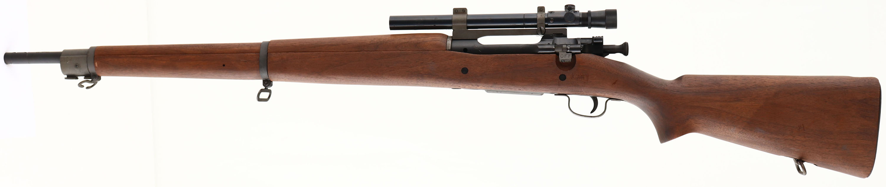 Gibbs Rifle Co (Remington) Model: 03-A3, Cal: .30-06, MFG: 1942, S/N: 3391121, Bolt action rifle, 24'' barrel. This is a Gibbs Rifle Company Rebuild rifle. They took 03-A3 Drill rifles that were de-milled & rebuilt them with new production barrels into complete rifles, this one was mocked up to look like a 03-A4 sniper. The Modern CMP, type C, Semi pistol grip stock is excellent with little to no wear. There is a ''C.M.P.'' in a box cartouche on the left side of the stock above the trigger. The gray/green parkerized finish rates 99% overall with light wear. The top of the receiver, under the scope mount, is marked ''U.S.'', ''REMINGTON'', ''MODEL 03-A3'', & S/N. the top end of the barrel is marked ''G.R.'', CROWN, ''5-09''. The bore is excellent. Its bright & mirror like with minor roughness in a spot. The rifle has no open sight but comes with a Replica M73B1 (Weaver 330) scope & replica scope mounts all marked Gibs Rifle Co.. The right side of the scope is marked ''TELESCOPE M73G1'', ''FM OPTICS'', ''GIBBS RIFLE CO.'', ''MARTINSBURG. WV''. The stock carries a grooved, parkerized, steel trapdoor buttplate. The inside of the trapdoor is empty. Rifle has both sling loops with the stacking loop. A excellent example of a rebuilt rifle. FFL or C&R Req. - Value: 700 to 1400