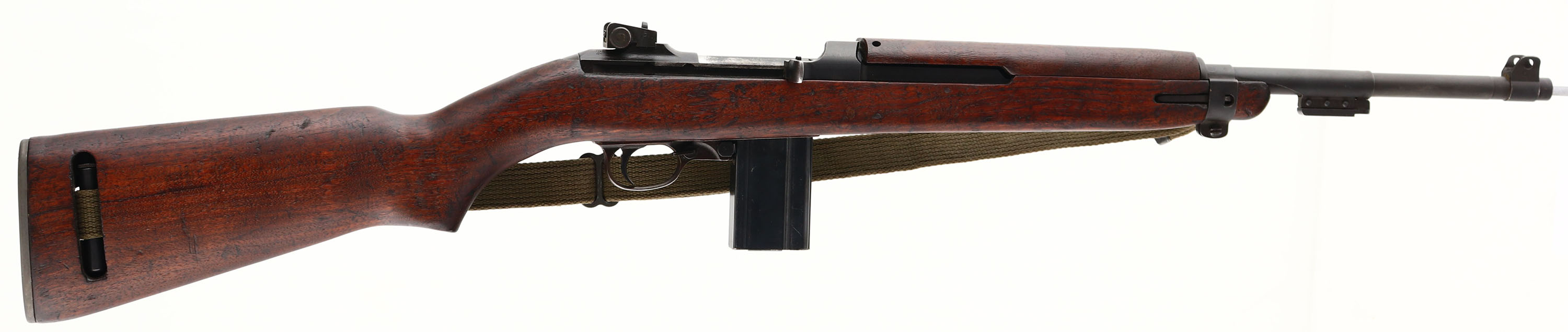 Winchester, Model: M1 Carbine, Cal: .30 Carbine, MFG: 1944, S/N: 5773884, Semi-auto rifle, 17 3/4'' barrel. The semi-pistol grip, Type 3 wood stock is very good with minor nicks, dings, scratches, & wear from use/age. The stock has no visible markings. The parkerized metal finish has full coverage & rates 95%. The receiver band is marked ''U.S.CARBINE'', ''CAL. .30M1''. The rear of the receiver is marked ''WINCHESTER'', & the S/N. the top end of the barrel is marked ''N''. The barrel band is marked ''JM''. The bore is excellent. Bright & mirror like with minimal wear. The barrel holds a wide blade front sight with protective wings. The rear of the receiver holds a fully adjustable aperture rear sight. The rear sight aperture leaf has been welded in the 100 yard zero & the windage elevation knob is missing & has been replaced with a normal screw. The right side of the rear sight base has a doubled stamped ''PI'' mark. The stock carries a checkered steel buttplate. The rifle has the oil bottle/ rear sling mount & the left side front sling loop. Rifle comes with a period correct canvas sling, oiler bottle, & one 15 Rd. magazine marked ''IS'' on the back. FFL or C&R Req. - Value: 1000 to 2000
