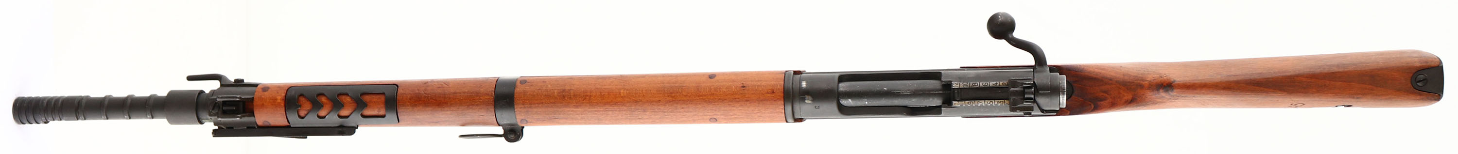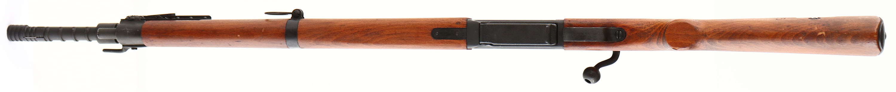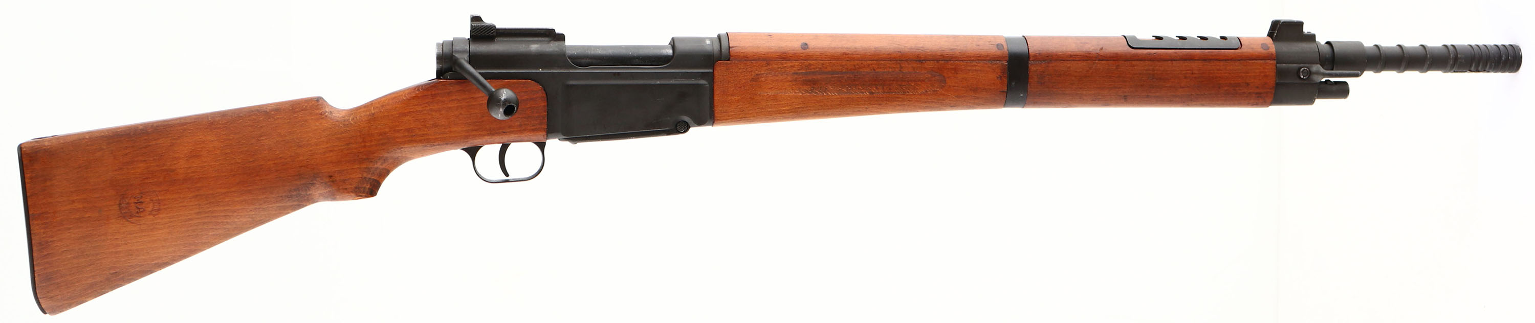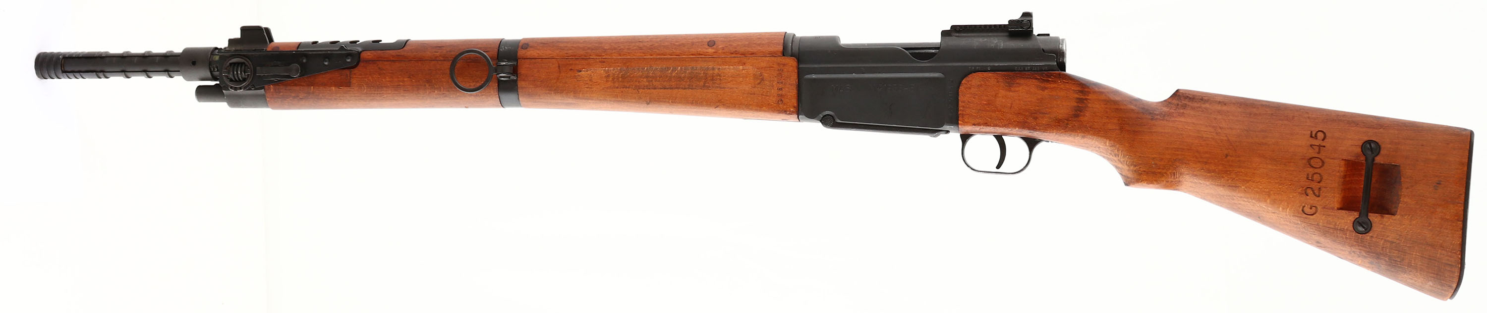 Manufacture d'Armes de Saint Etienne (MAS), Model: MLE 1936-51, Cal: 7.5x54mm, MFG: 1954-61, S/N: G25045, Bolt action Rifle, 24 3/4'' barrel. The semi-pistol grip 2 piece stock is excellent with little to no wear. The S/N is marked on the left side of the forend, in front of the receiver, & on the rear stock piece on the left side by the rear sling bar. The right cheek of stock is stamped with roundel acceptance cartouche that reads ''B'', ''DECEMBRE'', ''1957'', ''MA''. The grey parkerized metal finish rates 95% with light scratches on receiver. Left side of receiver is marked ''MAS MLE1936-51'', S/N, & importer marks, top of receiver is marked ''E''. Bore is excellent, near MINT. The barrel holds a Block/blade front sight with hood, Tangent aperture rear sight marked 2 to 12. rifle also has all the correct sights for the grenade launching attachment. stock carries a steel parkerized butt plate, side sling mounts. Rifle has the integral rod bayonet. The MAS 36-52 is just a normal MAS 36 with a Strengthened barrel & has equipped a 22mm NATO rifle grenade launcher. FFL or C&R Req. - Value: 400 to 800