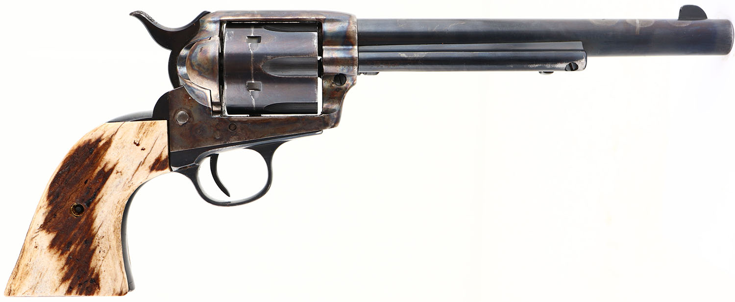 UNIQUE SET, Colt, 1873 Frontier Six Shooter, CAL: 44-40 WCF, MFG: 1902, SN: 232699, Single Action Revolver, 7 1/2'' barrel. The top of the barrel is marked ''COLT'S PT F.A MFG CO HARTFORD CT. U.S.A.''. The left side of the barrel is marked ''COLT FRONTIER SIX SHOOTER''. The left side of the frame is marked with the standard Colt patent dates. All matching SN on the frame, trigger guard & butt. This revolver was refinished at one time. The Stag horn grips are excellent, with nice figure & color. The reblued metal finish on the barrel rates 60%, with areas of thinning toned to a brown patina. The case-hardened frame retains faded, but visible case-colors. The trigger guard rates 95% & the cylinder rates 80%. There is intermittent rust spotting throughout the metal surfaces. Bore is good, with consistent roughness & light pitting. Integral small notch rear sight & blade front sight. This pistol is accompanied by a Tooled Money Belt circa 1890-1910 with loops for 44-40 (marked 44-40). The belt carries a Montgomery & Ward Co. ''Horse & Rider'' holster made circa 1915-25 & a well-made custom vintage knife sheath that holds an Edge Brand - Original Bowie Knife with Stag horn grips, made in Solingen Germany. A very unique & well compiled set. FFL or C&R Req. - Value: 3000 to 5000