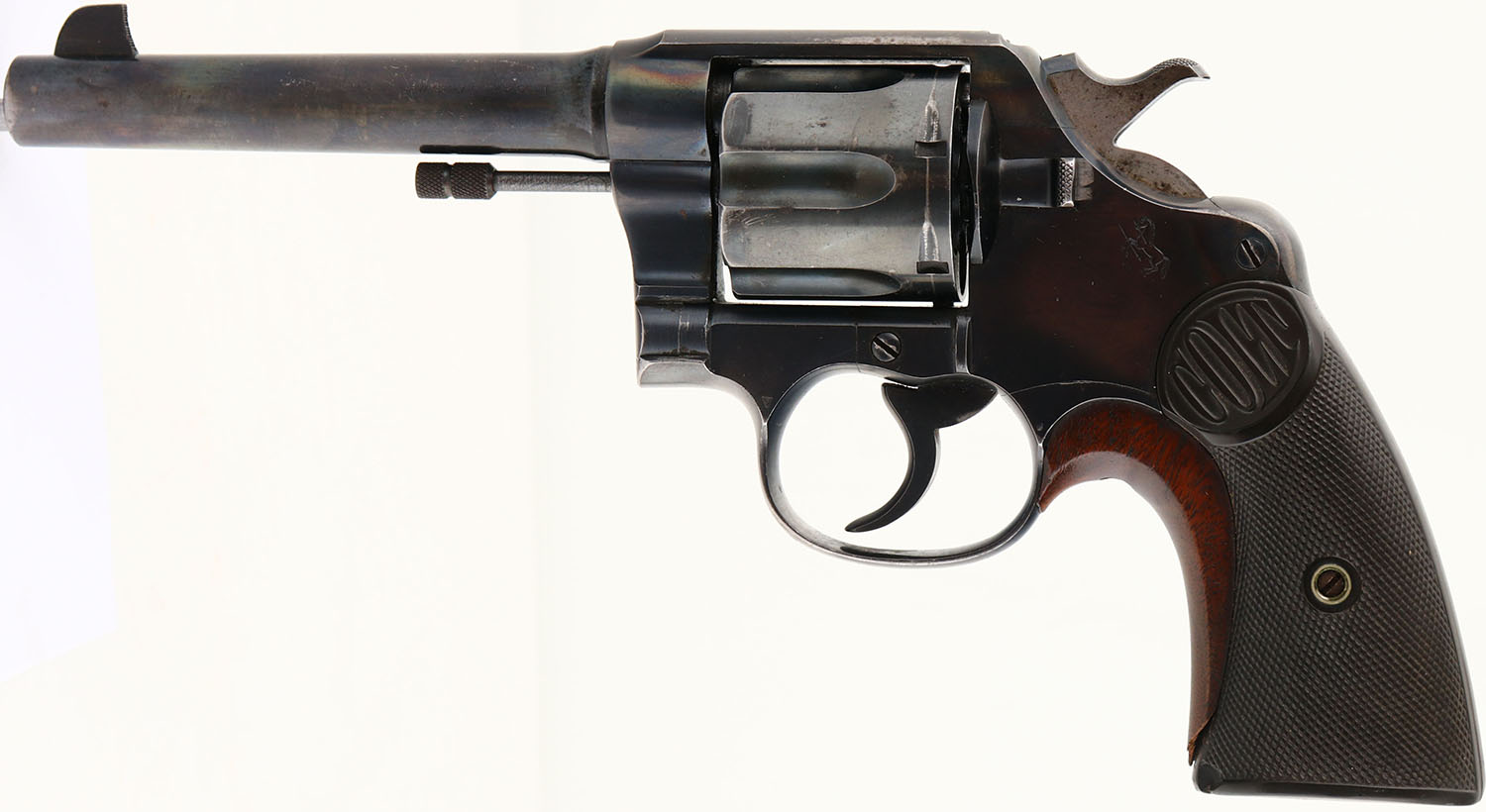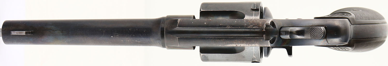 Colt, New Service Model 1909 Transition, CAL: 45 COLT, MFG: 1924, SN: 320091, Double Action Revolver, 5 1/2'' barrel. The Colt checkered hard rubber grips are excellent. The bottom front corner of the left grip does have a small edge chip, otherwise excellent. Added wood grip insert, with an edge chip. The revolver appears to have been refinished at one time. The address & patent dates appear thin from being buffed. The barrel rates 70%, with areas worn to metal gray, toned to brown patina & a discolored heat exposure spot between the address stamp & front sight. The metal blue finish on the frame rates 85%, with concentrated loss on the top strap, along with similar heat exposure discolorations on both sides of the top strap. The cylinder rates 70%, with scratches, spotting & areas worn to metal gray, toned to a brown patina. The metal blue finish on the trigger guard rates 60%, with concentrated loss on the front & back strap. Lanyard loop has been removed & stud was smoothed. Bore is excellent, with intermittent speckling & light wear marks. Integral notch rear sight & dorsal fin blade front sight. FFL or C&R Req. - Value: 400 to 800