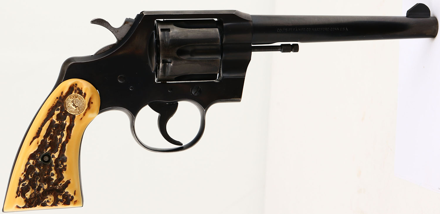 Colt, Official Police - Post-War, CAL: 38 SPL, MFG: 1958, SN: 862684, Double Action Revolver, 6'' barrel. The Colt logo medallion plastic stag grips are excellent. They have toned butterscotch. The metal blue finish rates 85% on the barrel, with holster wear/ The frame rates 85%, with concentrated loss to the back strap, top strap & trigger guard. The cylinder rates 70%, with areas worn to metal gray with a thin brown patina. Bore is excellent. Integral square notch rear sight & serrated blade front sight. FFL or C&R Req. - Value: 350 to 600