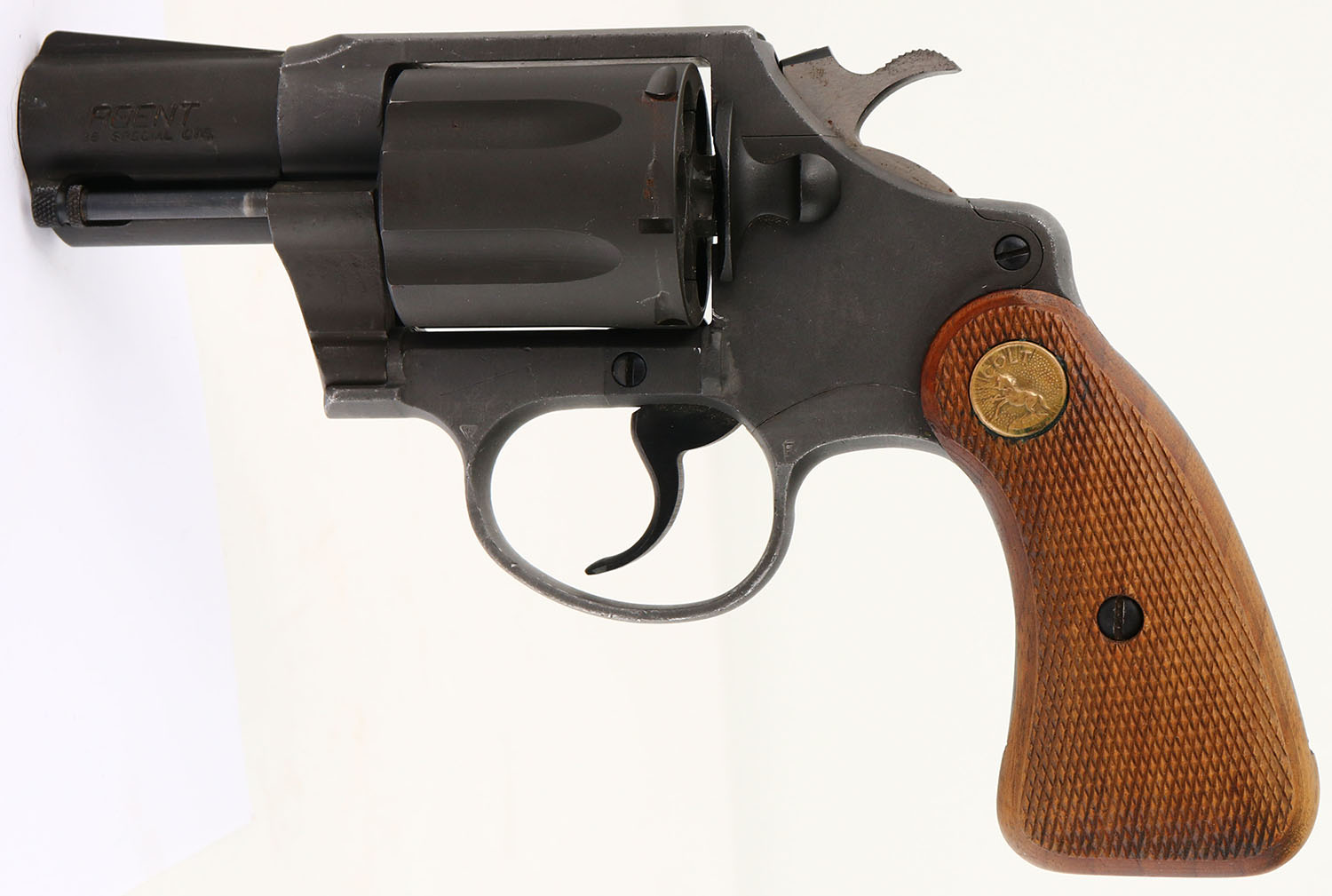 Colt, Agent L.W. - 2nd Issue, CAL: 38 SPL, MFG: 1982, SN: W14900, Double Action Revolver, 2 1/4'' barrel. The Colt logo medallion wraparound checkered wood grips are excellent. The restored matte finish is very good. There cleaned pitting on the outside of the cylinder swing gate that has finish in it, along with multiple minor scrapes, dings & nicks to the finish. Bore is excellent, with light frosting in the lands & grooves. Integral notch rear sight & smooth ramp front sight. FFL Req. - Value: 250 to 450