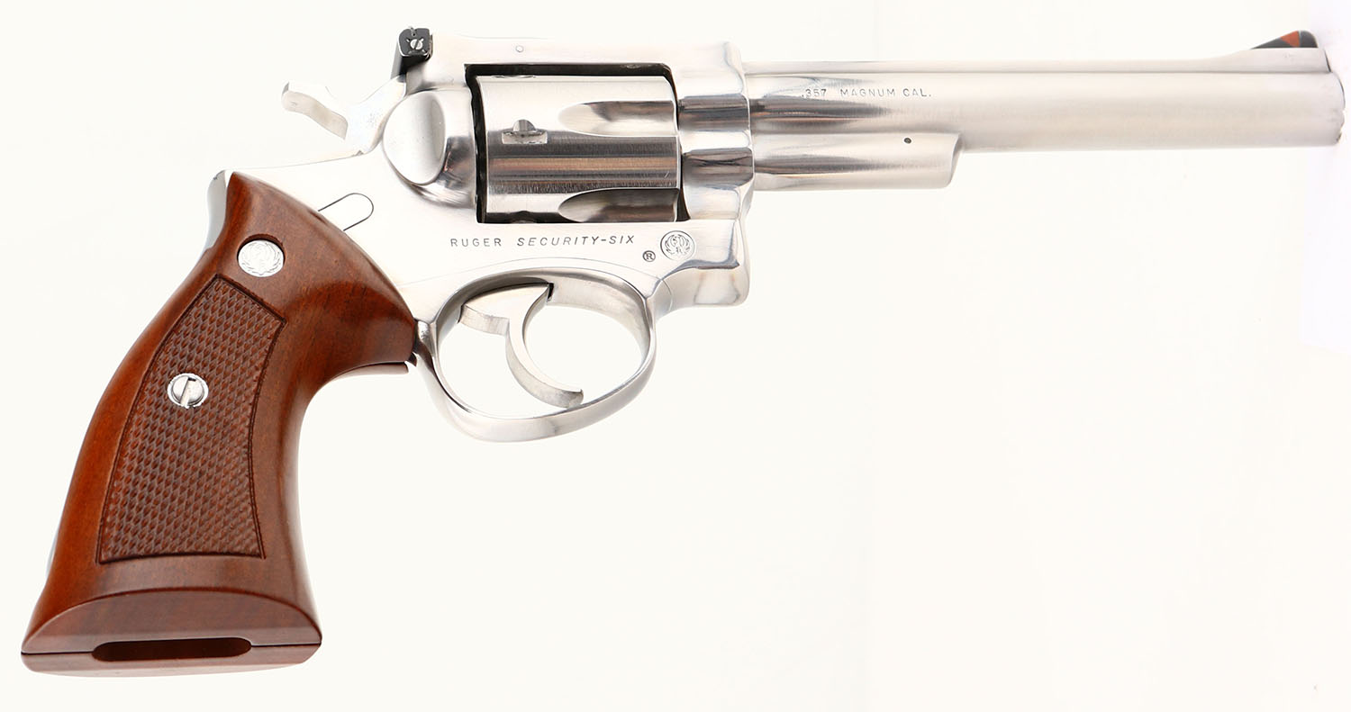 CASED, Ruger Security Six - Ohio State Highway Patrol Golden Anniversary Edition, CAL: 357 MAG, MFG: 1983, SN: OSP0630, Double Action Revolver, 6'' barrel. Standard factory markings & the right side of the frame carries the Ohio State Highway Patrol crest. The Ruger logo medallion checkered wood grips are excellent. The stainless steel finish is excellent overall. Bore is excellent. Adjustable rear sight & serrated blade front sight with orange insert. Comes in factory presentation case, with burgundy interior. FFL Req. - Value: 600 to 900
