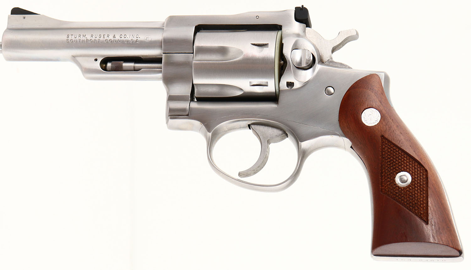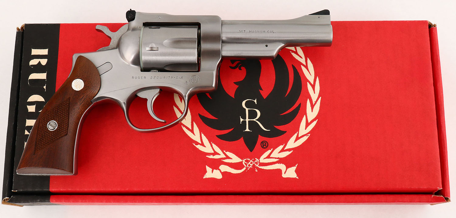 NEW BOXED, Ruger, Security-Six, CAL 357 MAG, MFG: 1977, SN: 153-24610, Double Action Revolver, 4'' barrel. The Ruger logo medallion checkered woos grips are mint. The stainless steel finish is excellent overall. Bore is mint. Adjustable rear sight & elevated serrated blade front sight. Comes in factory box, with related paperwork, original packaging & factory cardboard sleeve with end label. FFL Req. - Value: 500 to 650
