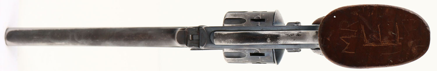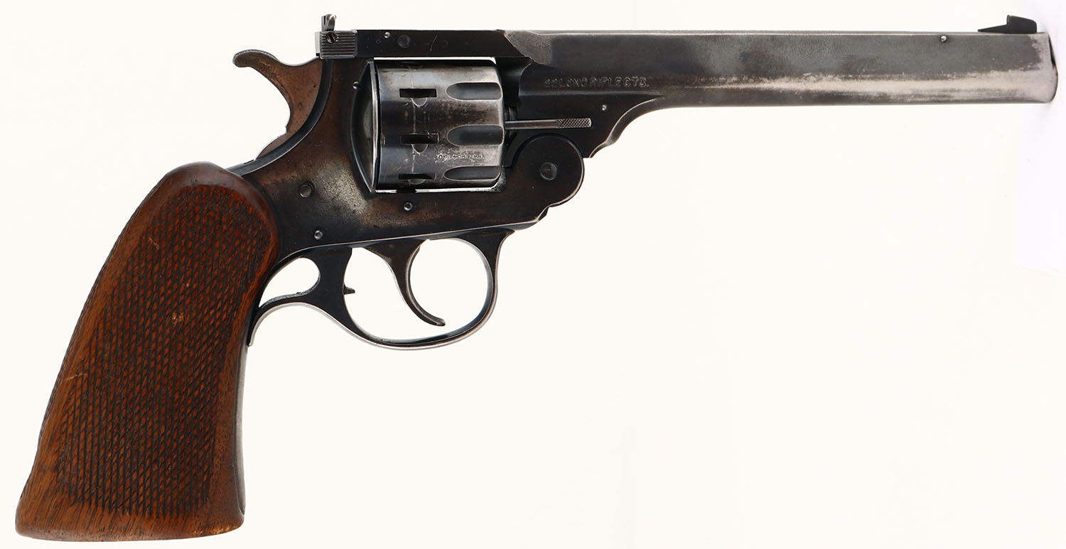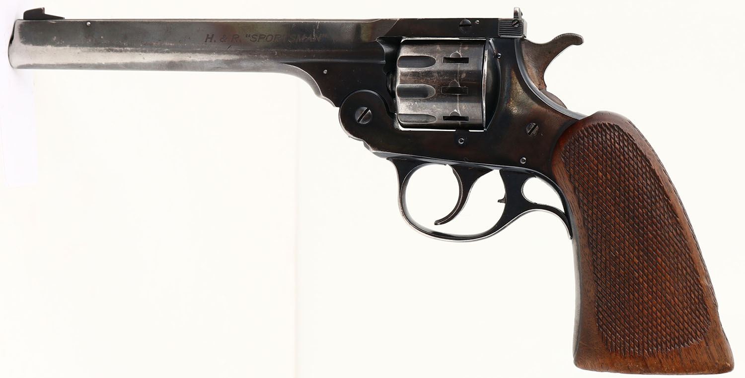 Harrington & Richardson, H&R Sportsman 999, CAL: 22LR, MFG: 1943, SN: D20320, 9 Shot Double Action Revolver, 6'' barrel. The checkered wood grips are very good & solid. There is even overall wear, smooth checkering & the bottom of the grips have ''MRE'' scratched into them. The metal blue finish on the barrel rates 50% & the frame rates 85%, with concentrated loss to the front strap. Bore is excellent, with visible light wear. Adjustable rear sight & blade front sight. FFL or C&R Req. - Value: 200 to 400