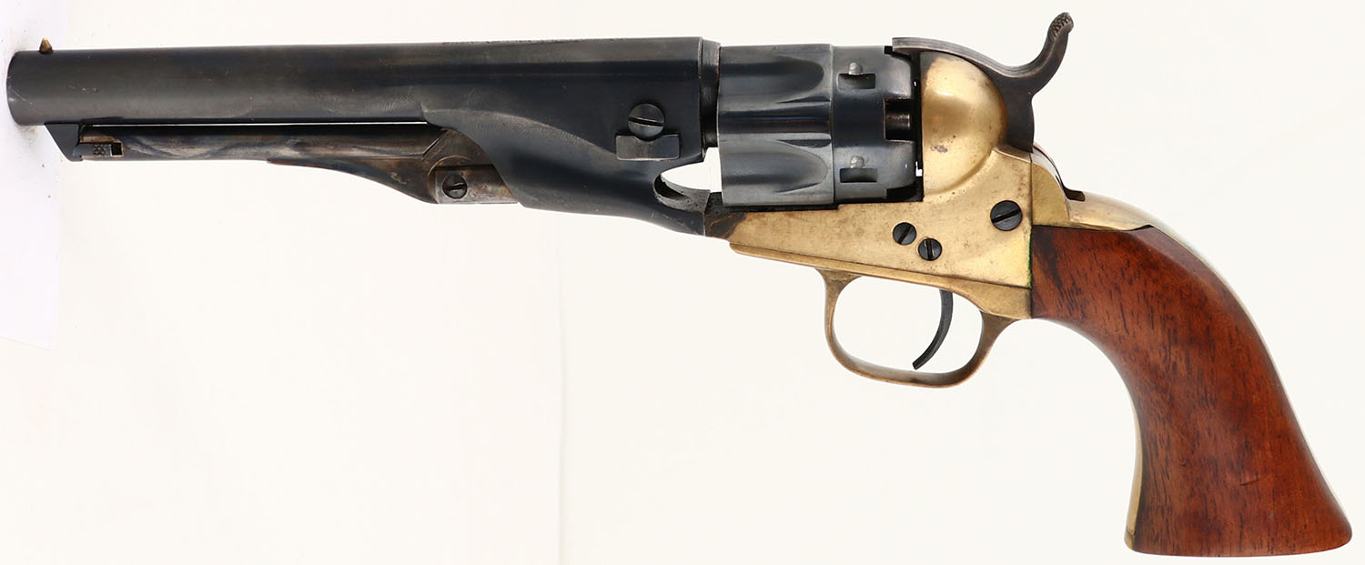 Connecticut Valley Arms, 1862 Police Revolver, CAL: .36, MFG: Modern, SN: A62543, Single Action Percussion Revolver, 5 1/2'' barrel. The metal blue finish on the barrel & cylinder rates 98%. The brass frame & trigger guard have an aged patina, with intermittent spotting. Bore is good & bright, with consistent pitting throughout. Small hammer notch rear sight (when cocked) & small brass bead front sight. Blackpowder, No FFL Req. - Value: 200 to 400
