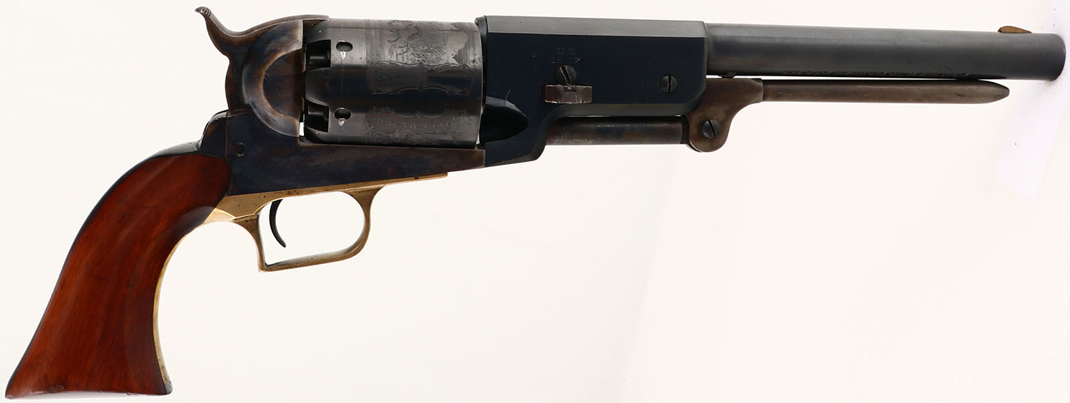 A.S.M., 1847 Walker, CAL: 44, MFG: Modern, SN: D97793, Single Action Percussion Pistol, 9'' barrel. The wood grips are very good & solid, having been repaired, light sanded & refinished. The left grip has a fill repair, along with minor handling marks & couple areas of flaking finish on the butt. The metal blue finish on the barrel & cylinder rates 95%, with chatter marks around the barrel wedge & the cylinder roll stamp is toning to a brown patina. The case-hardened frame retains nice case-colors, with areas worn to metal gray & spotting toned to a brown patina. Bore is excellent. Small hammer notch rear sight (when cocked) & small brass blade front sight. Blackpowder, No FFL Req. - Value: 300 to 500