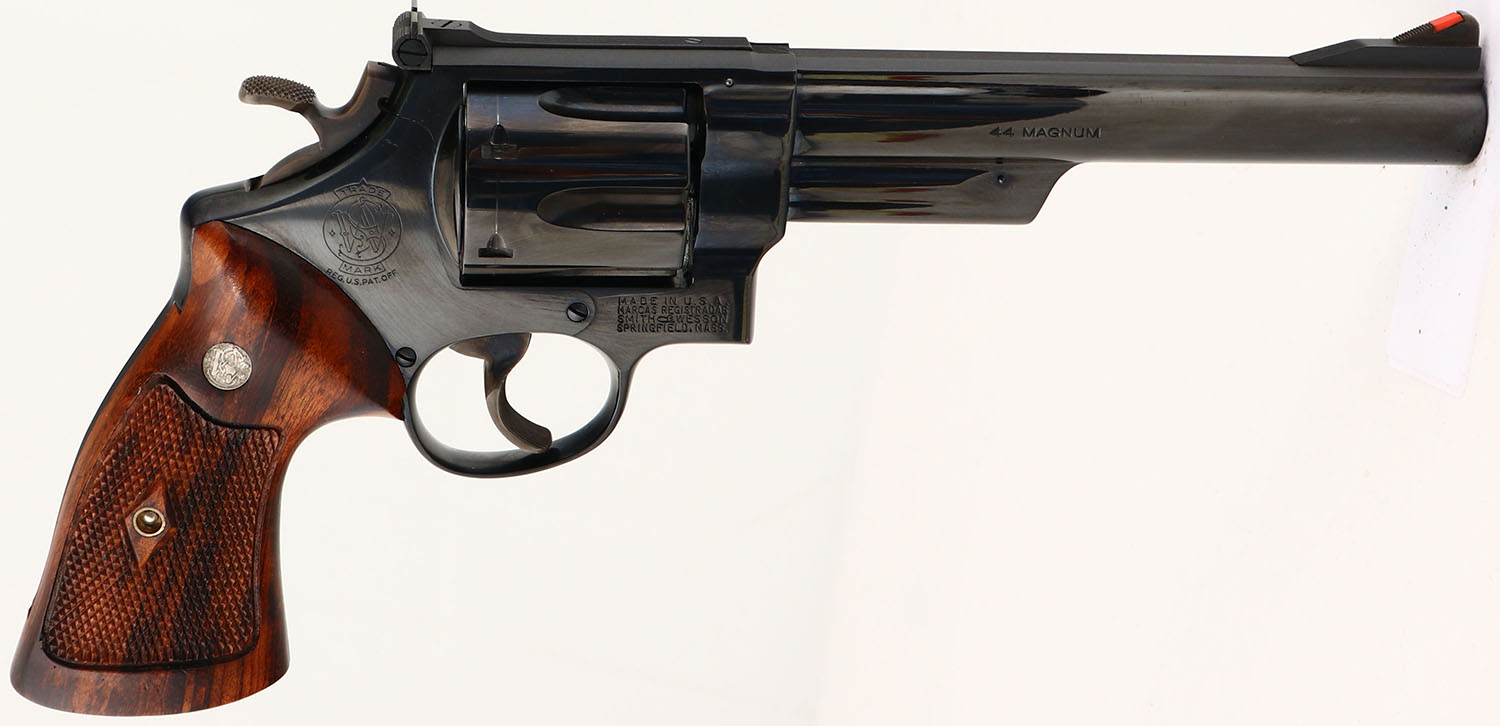 PRESENTATION CASED, Smith & Wesson, Pre-Model 29 Four Screw, CAL: .44 MAG, MFG: 1957, SN: S172134, Double Action Revolver, 6 1/2'' barrel. The S&W logo medallion ''Coke Bottle'' wood grips are excellent. The grips appear to have a hand applied oil finish, that has darkened the left grip overall & enhanced the darker grains in the right grip. The original metal blue finish rates 98% overall. The case-hardened trigger & hammer retain excellent case-colors. Factory adjustable micrometer click rear sight & serrated blade front sight with red insert. Bore is excellent. Comes in a rare & highly collectible dark blue pebble grain leatherette presentation case with green velvet lining, marked S&W .44 MAGNUM on the lid. This seldom seen set would be a nice addition to any S&W collection.* FFL or C&R Req. - Value: 3500 to 5500