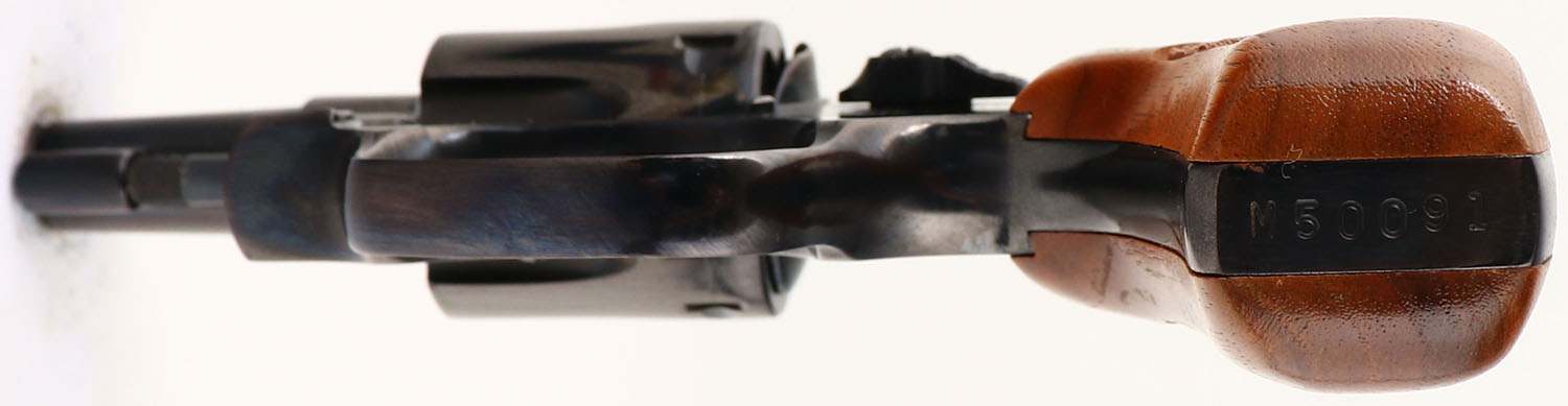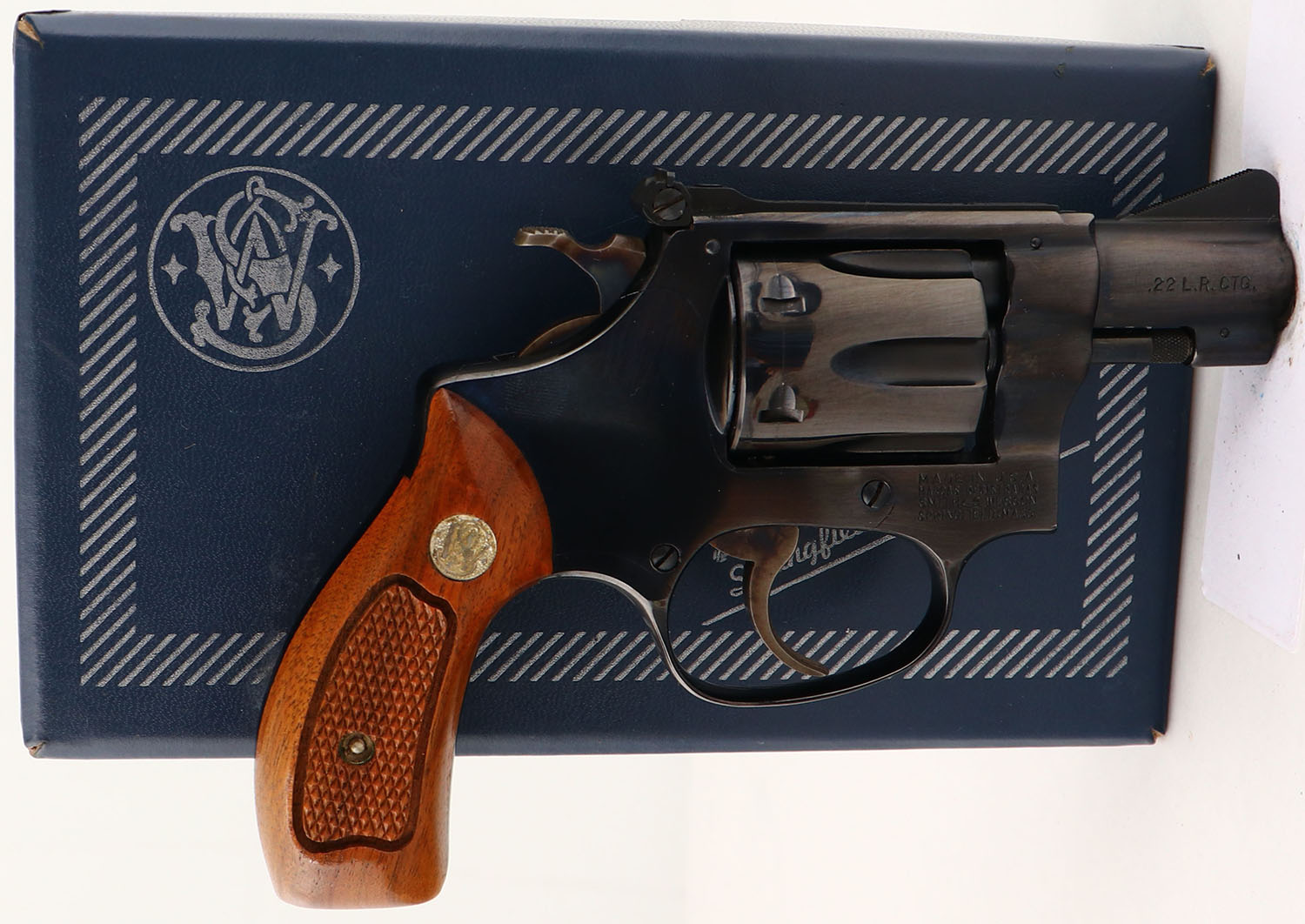 BOXED, Smith & Wesson, Model 34-1, CAL: .22LR, MFG: 1971-73, SN: M50091, Double Action Revolver, 2'' barrel. The S7W logo medallion checkered wood grips are excellent. The original metal blue finish rates 99%+ overall. The case-hardened trigger & hammer retain excellent case-colors. Bore is excellent. Adjustable rear sight & serrated blade front sight. Comes in SN matching box, with related paperwork, cleaning brush/rod & original packaging. FFL or C&R Req. - Value: 600 to 900