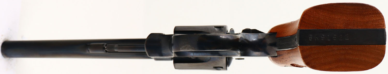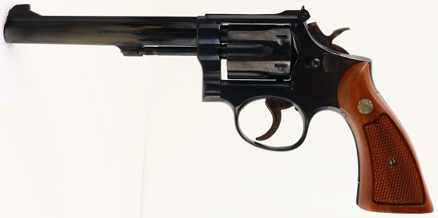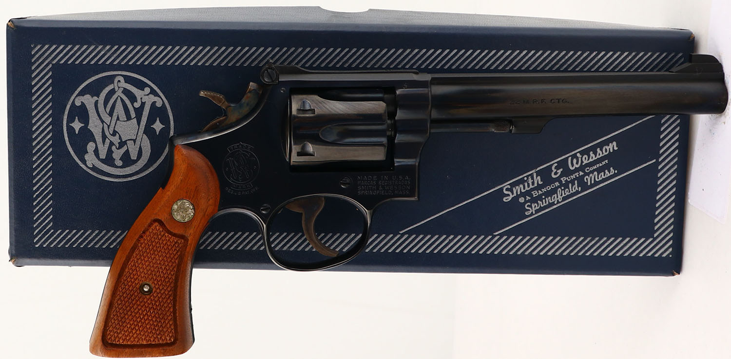 BOXED, Smith & Wesson, Model 48, CAL: 22 MRF, MFG: 1974, SN: 5K91522, Double Action Revolver, 6'' barrel. The S&W logo medallion checkered wood grips are excellent. The original metal blue finish rates 99%+ overall. The case-hardened trigger & hammer retain excellent case-colors. Bore is mint. Adjustable rear sight & serrated blade front sight. Comes in SN matching box, with related paperwork, cleaning brush/rod & original packaging. FFL or C&R Req. - Value: 1000 to 1500