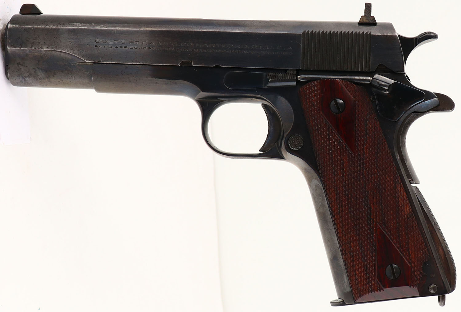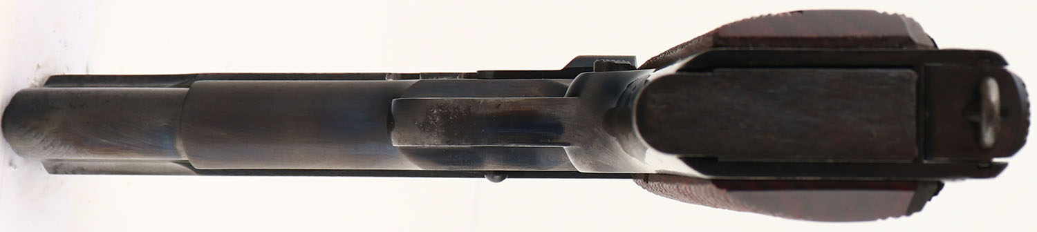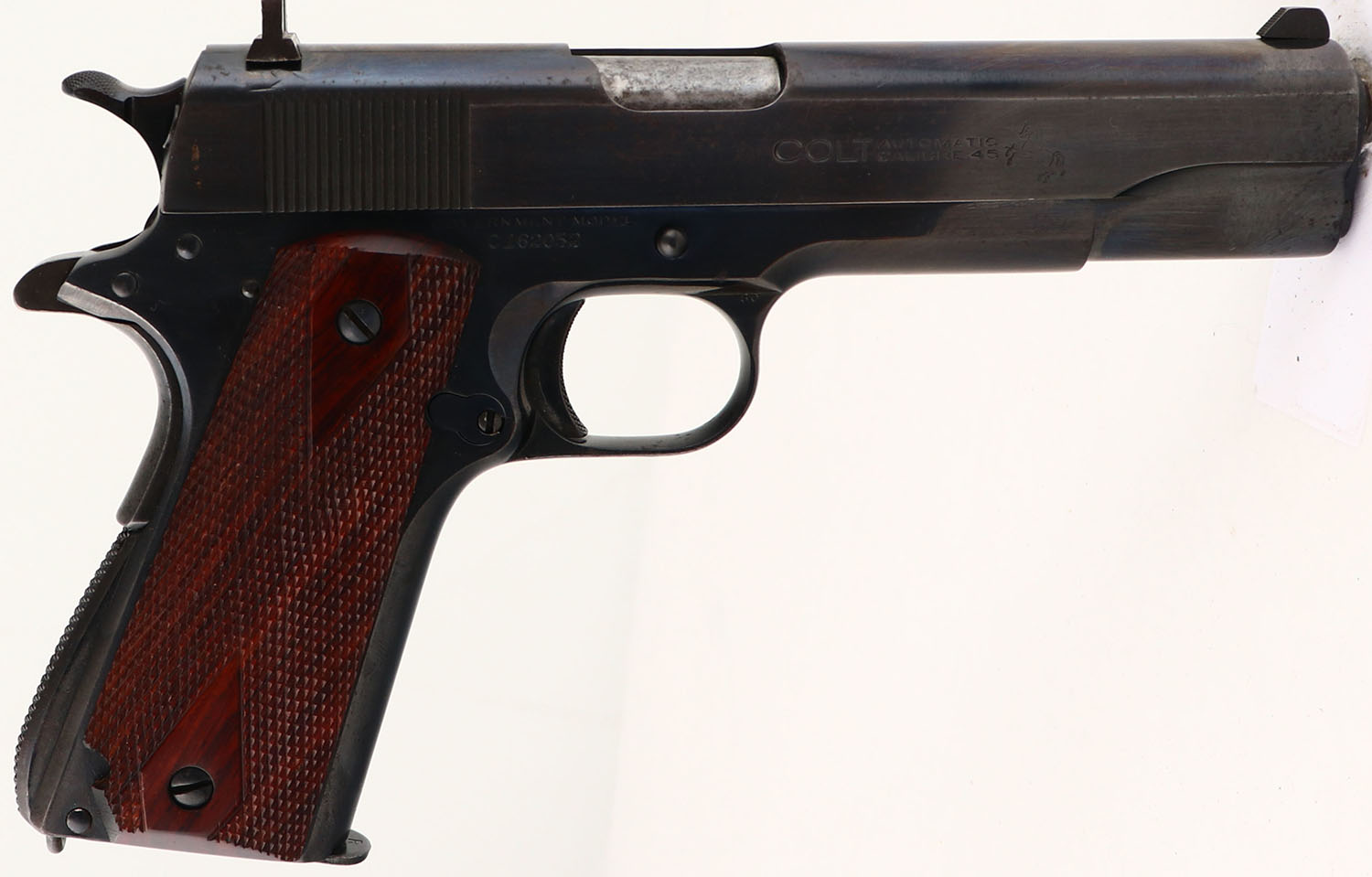 Colt, Model: M1911A1 Government Model, Cal: .45 ACP, MFG: 1932, S/N: C162052, Semi-auto pistol, 5'' barrel. The checkered, diamond grips are excellent. The reblued metal finish on the frame rates90%, while the blue on the slide rates 85%, with spotty thinning & speckling. The darker tone on the front 1/3 of the slide is from that part being hardened to help increase its strength, leading to the metal holding onto the bluing better than the un-hardened section. The left side of the slide is marked ''COLT'S PT.F.A.MFG.CO.HARTFORD.CT.U.S.A.'', & under that is a line of Colt's patent dates. The right side of the slide is marked ''COLT AUTOMATIC CALIBRE .45'' & a rampant Colt logo. The right side of the frame is marked ''GOVERNMENT MODEL'', & the S/N. The left side of the trigger guard is marked with a ''VP'' in a triangle stamp, which is the Colt verified proof factory inspection stamp. The right side of the trigger guard is marked ''60''. The bore is excellent. The slide holds a replaced target sights, which are a taller front sight & a taller square notch rear sight. Pistol comes with one mag marked ''C-R'' on the bottom of the floorplate & ''R'' on the upper part of the floor plate. A very nice example of a pre-WW2 Colt Government Model. FFL or C&R Req. - Value: 1000 to 2000