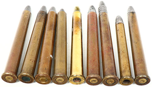 Lot of 9. (8) 28-30 Stevens Single Shot. Most of these have dented primers. Good for reloading. (1) 25-21 Single Shot. No primer. Grade: Very Good + - Value: 20 to 40