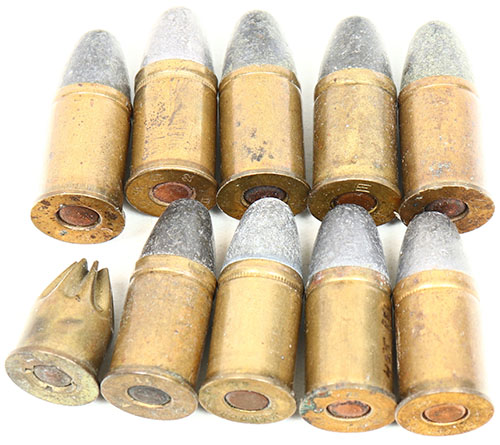 Lot of 10. .455 Webley Revolver. 8 Mk II ball loads, 1 commercial ball (kynoch), 1 military blank. Grade: Very Good + - Value: 20 to 40