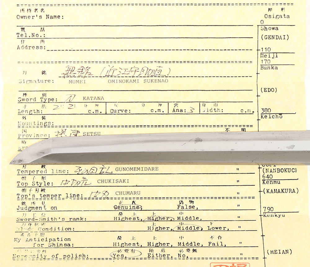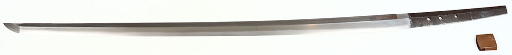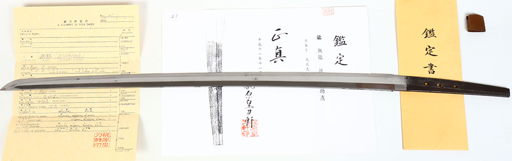 Exceptional Antique Japanese Katana. 38 3/8'' overall and 26 1/2'' cutting edge. Mounted in Shira-saya - a storage sheath, made from Japanese Magnolia wood. There are indications that this is a Tachi - ''great sword or long sword'' that has been cut down to Katana size over the years. This blade has been brought to Shinsa - a committee of Japanese sword experts that judges and completes paperwork on the sword, providing provenance showing the following: Blade is not signed, however the swordsmith is attributed to Ominokami Sukenao a higher ranking swordsmith who made this blade over 300 years ago. It was made in the Setsu province and displays a Gunomemidare temper line. Also included is an Oshigata - a rubbing of the blade's tang. There are 3 Mekugi-ana - the holes in tang for bamboo peg that holds the handle to the blade, which is one of the indicators of the age of blade and in this case that this sword has been cut down at least 2 times. Variations in the file markings in the Nakago - tang, also contribute to this conclusion. This blade has very fine forging grain in the steel and a straighter temper, along with fine Nie and Nioi - the crystallization within the metal along the edge of the Hamon - temper line, typically visible only on higher quality Japanese swords and that run along the edge of the Hamon which has the subtle Gunomemidare - along with irregular or ragged activity within. Copper one piece Habaki - a metal collar around the blade above the tang that holds the blade securely in the scabbard. Polisher's marks under Habaki and at the Kissaki - tip of the blade, are marks of a higher grade temper and polish on the blade. There are some very, very small chips at the tip of blade and along the cutting edge about 10'' from the tip, possibly from use in battle or duels, that would easily polish out. A very nice old blade made in the 1600-1700's with paperwork that is in itself difficult to acquire. This quality of Japanese swords are getting more and more difficult to obtain as many reside in museums and collections around the world. If you would like to preview these you will need to make an appointment before hand. - Value: 8000 to 12000