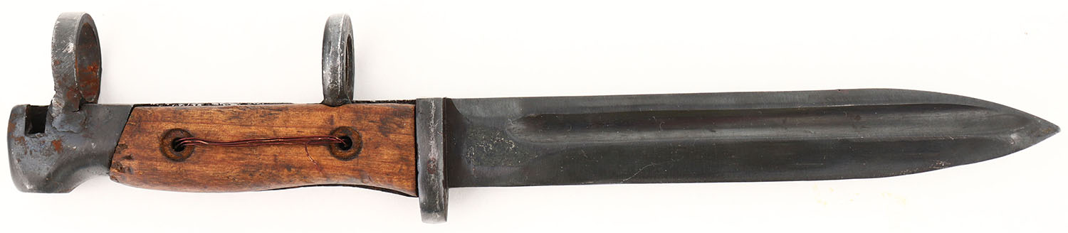VERY SCARCE, ONE OF 3 KNOWN. Mexican Model 1910 Mauser Bayonet FAL trial conversion. The bayonet has been re-blued & has cleaned pitting under the finish all along the blade. There if a faint mark on the left side of the blade. The wood grips have small cracks, chips, dings, & wear from use. The grips are also held on with wire. Two muzzle rings have been welded to the back spine of the bayonet. The bayonet has a few spots of light rust. These bayonets were a attempt to convert the bayonets for the M1910 Mausers, for use with the FAL Mexico was about to adopt. Instead of buying new Bayonets from FN, they wanted to use up the large stockpile of bayonets they had. Ultimately it would not workout & Mexico would just buy the standard Bayonet from FN alongside the rifles. The consigner states this is one of three known to exist. Grade: Very Good - Value: 100 to 500
