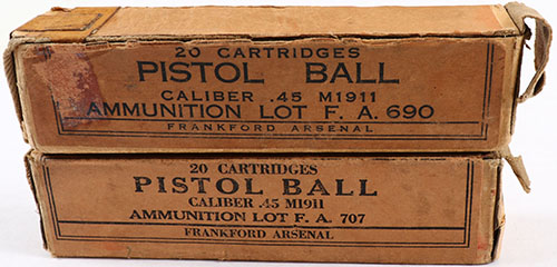 Lot of two, Frankford Arsenal, Cal. .45 M1911 Ball, ammo boxes, 1pc boxes, one full & one is FULL & SEALED, brown boxes with buff label & black print, boxes have age soiling, stains, & rub marks. The ammo in the open box ranges from very good to good. Grade: Very Good - Value: 20 to 40