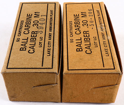 Lot of two, Lake City, .30 carbine M1 Ball, 1pc, both Full. brown boxes with black print, boxes have stains & wear, ammo is excellent. Grade: Excellent - Value: 40 to 100