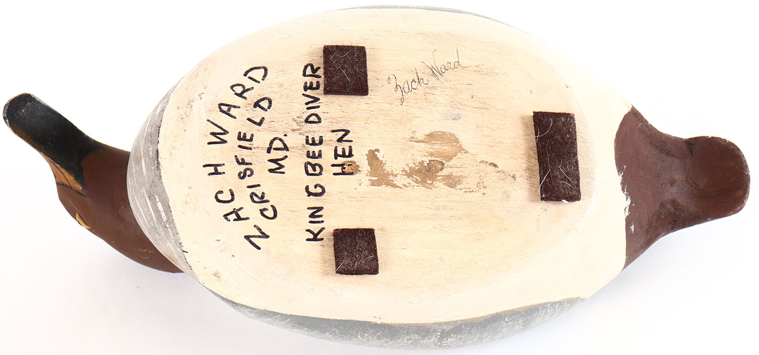 Goldeneye Hen by Zach Ward, Crisfield, MD, King Bee Diver, tack eyes, solid wood, original paint, structurally excellent, signed on bottom. Grade: Excellent - Value: 20 to 40