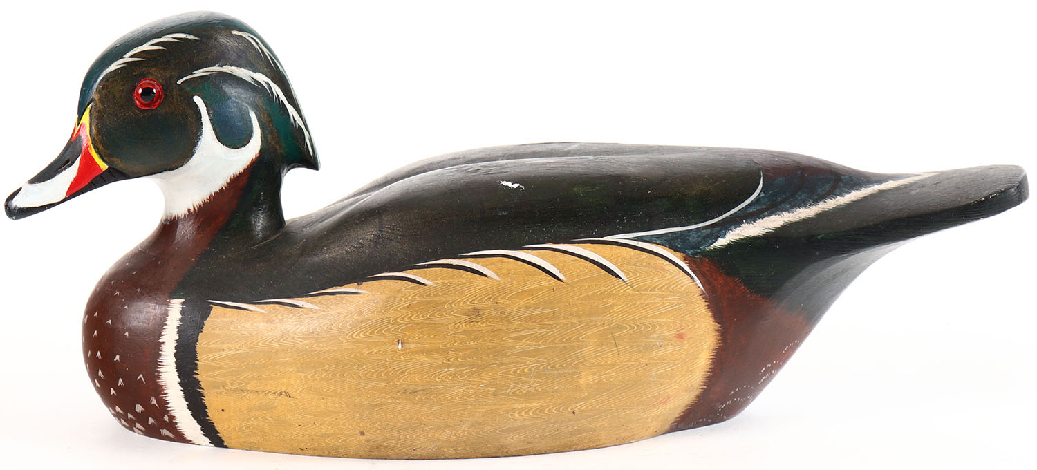 Woodduck Drake by unknown maker, glass eyes, hollow wood, original paint with a couple minor wear pots, structurally excellent. Grade: Excellent + - Value: 30 to 60