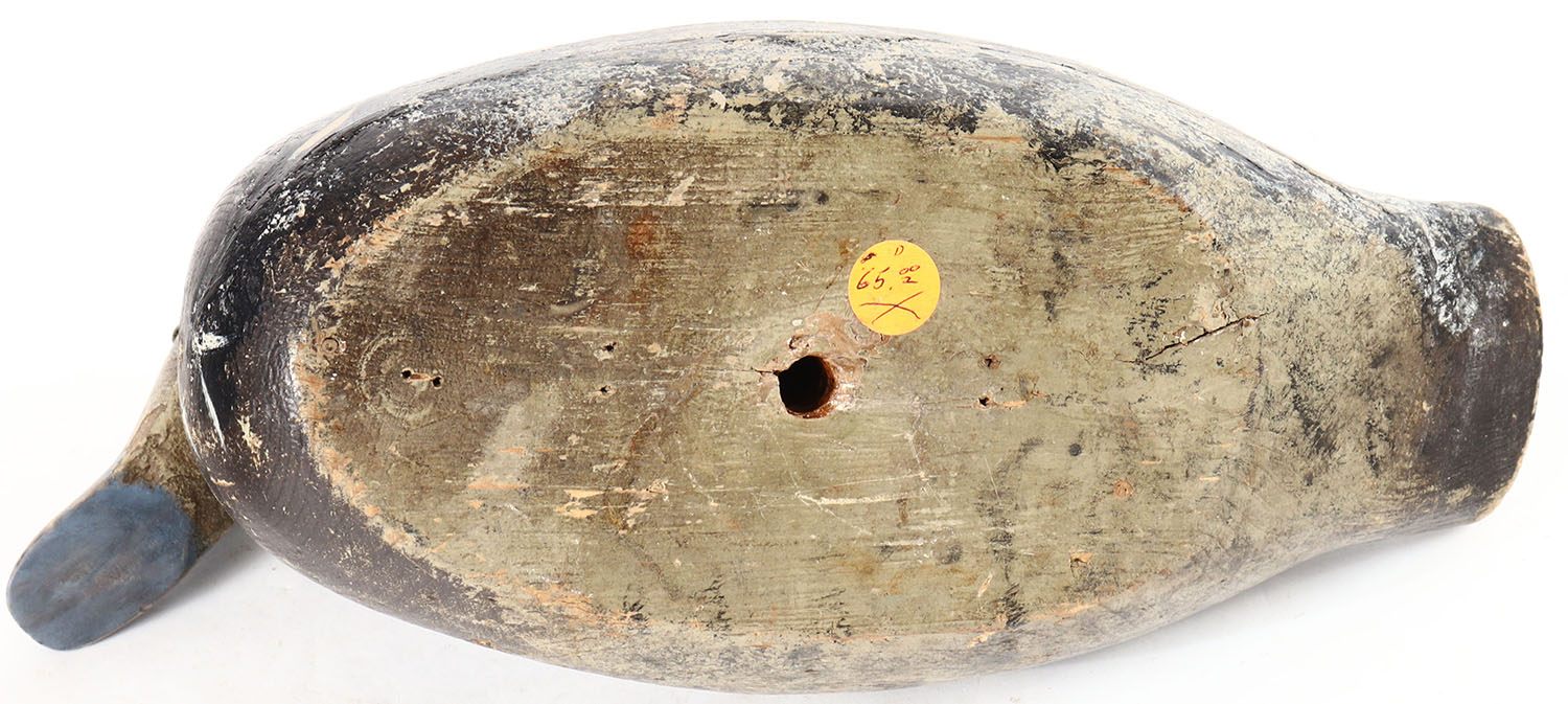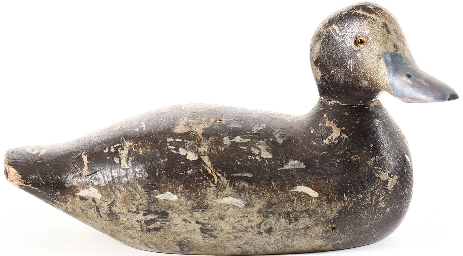Bluebill Hen by Pratt Decoy Co., Chicago, IL, 1921-1939, glass eyes, solid wood, mixture of original paint and working touch-up, has wear to body. Grade: Very Good ++ - Value: 10 to 40