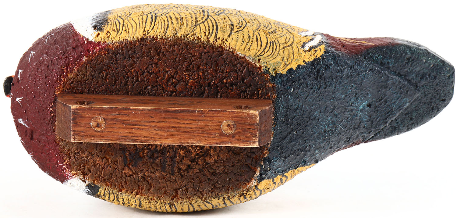 Woodduck Drake by unknown maker, glass eyes, solid cork body, original paint, structurally excellent. Grade: Excellent + - Value: 10 to 30