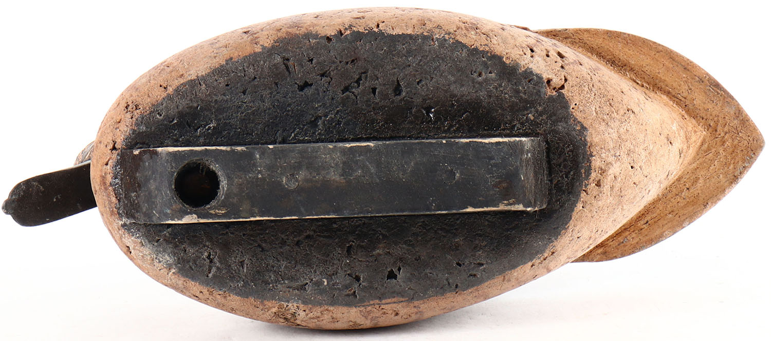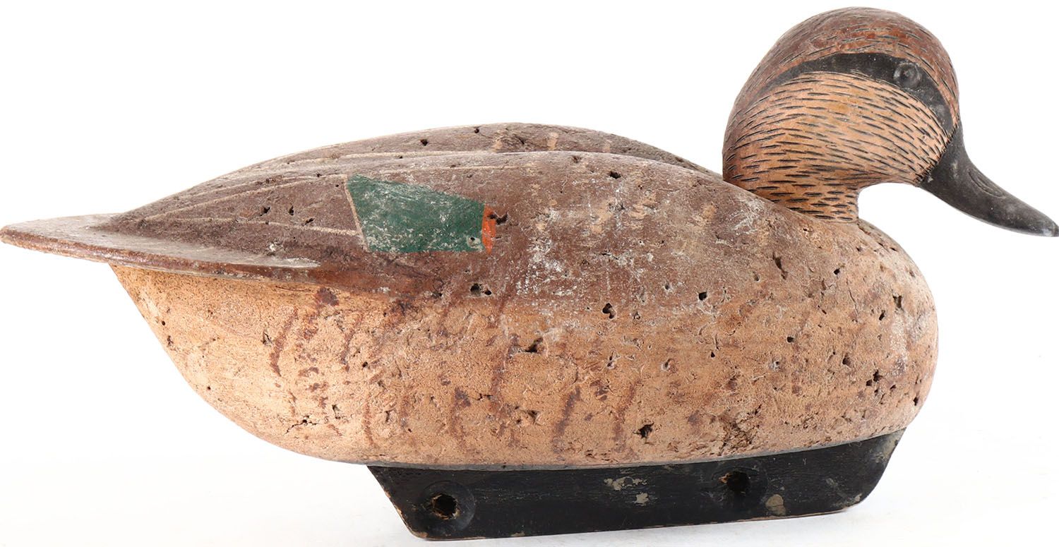 Green Winged Teal Hen by unknown maker, glass eyes, solid cork body, original paint, structurally excellent. Grade: Excellent - Value: 10 to 40