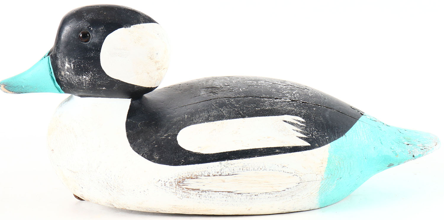 Bufflehead Drake by unknown maker, glass eyes, solid wood, original paint, has age cracks on back. Grade: Very Good + - Value: 10 to 20