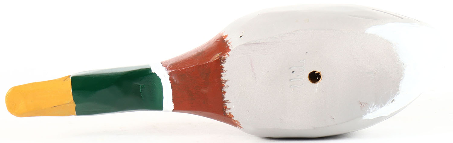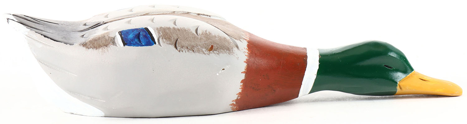 Swimming Mallard Drake by unknown maker, painted eyes, solid wood, original paint, has some wear to paint on each side of body. Grade: Very Good + - Value: 10 to 30